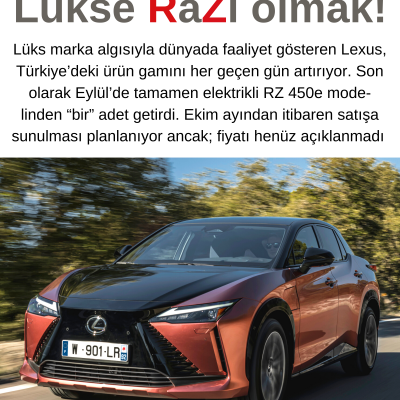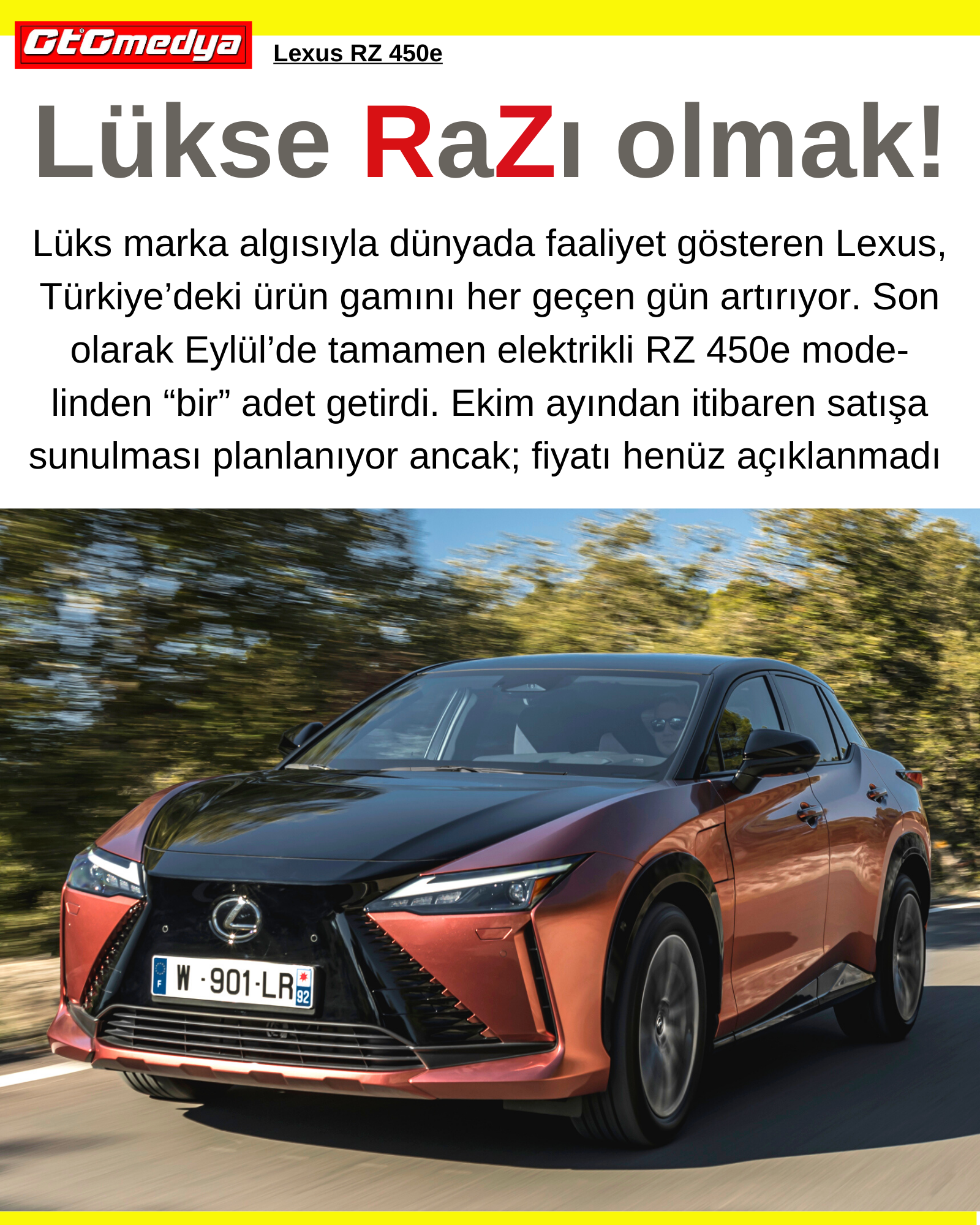 Lüks marka algısıyla dünyada faaliyet gösteren Lexus, Türkiye’deki ürün gamını her geçen gün artırıyor. Son olarak Eylül’de tamamen elektrikli RZ 450e modelinden “bir” adet getirdi. Ekim'den itibaren satışa sunulacak ama; fiyatı henüz açıklanmadı.