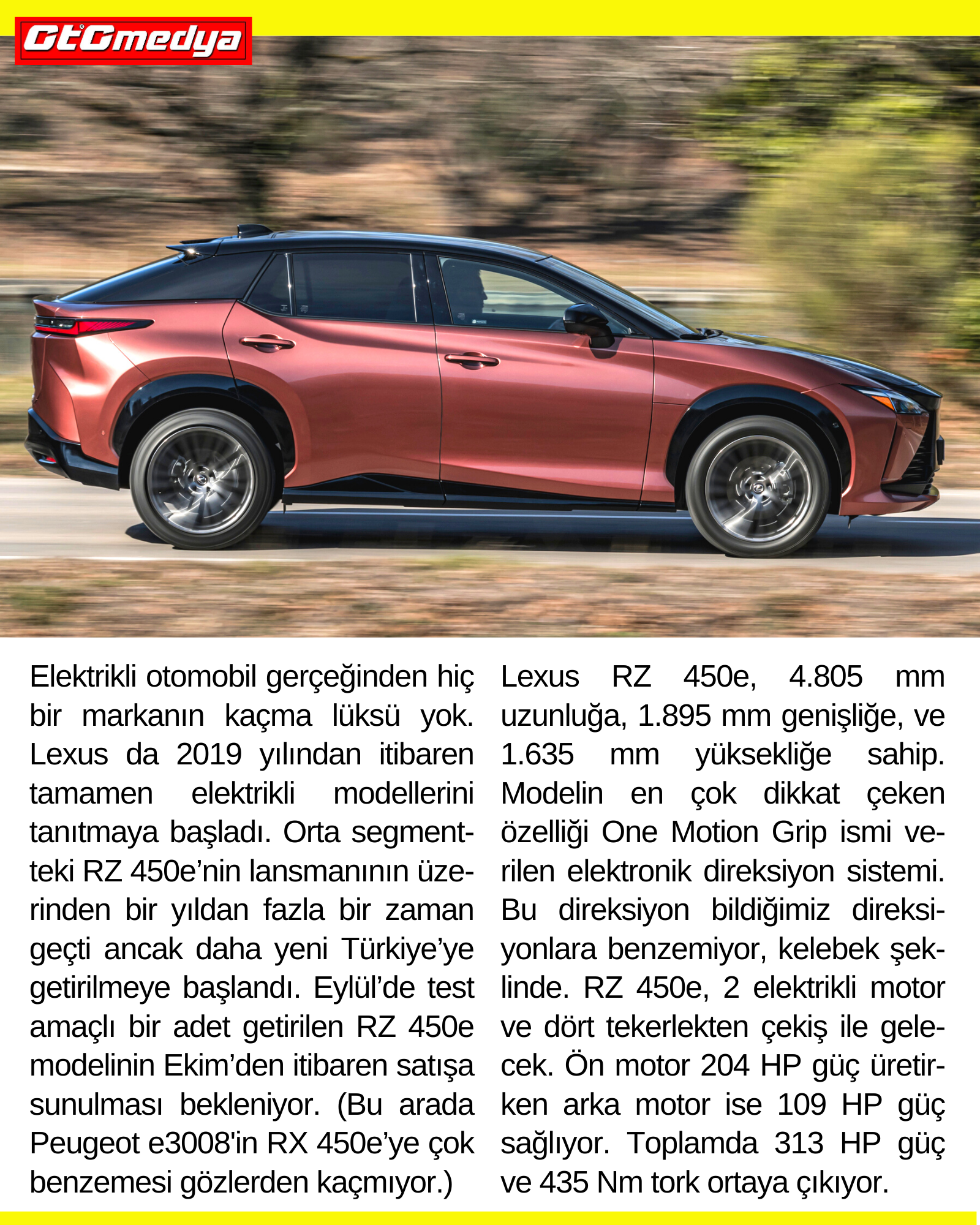 Elektrikli otomobil gerçeğinden hiç bir markanın kaçma lüksü yok. Lexus da 2019 yılından itibaren tamamen elektrikli modellerini tanıtmaya başladı. Orta segmentteki RZ 450e’nin lansmanının üzerinden bir yıldan fazla bir zaman geçti ancak daha yeni Türkiye’ye getirilmeye başlandı. (Bu arada Peugeot e3008'in RX 450e’ye çok benzemesi gözlerden kaçmıyor.)