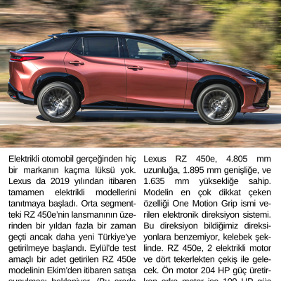 Lexus RZ 450e, 4.805 mm uzunluğa, 1.895 mm genişliğe, ve 1.635 mm yüksekliğe sahip. Modelin en çok dikkat çeken özelliği One Motion Grip ismi ve-rilen elektronik direksiyon sistemi. Bu direksiyon bildiğimiz direksiyonlara benzemiyor, kelebek şek-linde. RZ 450e, 2 elektrikli motor ve dört tekerlekten çekiş ile gelecek. Ön motor 204 HP güç üretirken arka motor ise 109 HP güç sağlıyor. Toplamda 313 HP güç ve 435 Nm tork ortaya çıkıyor.