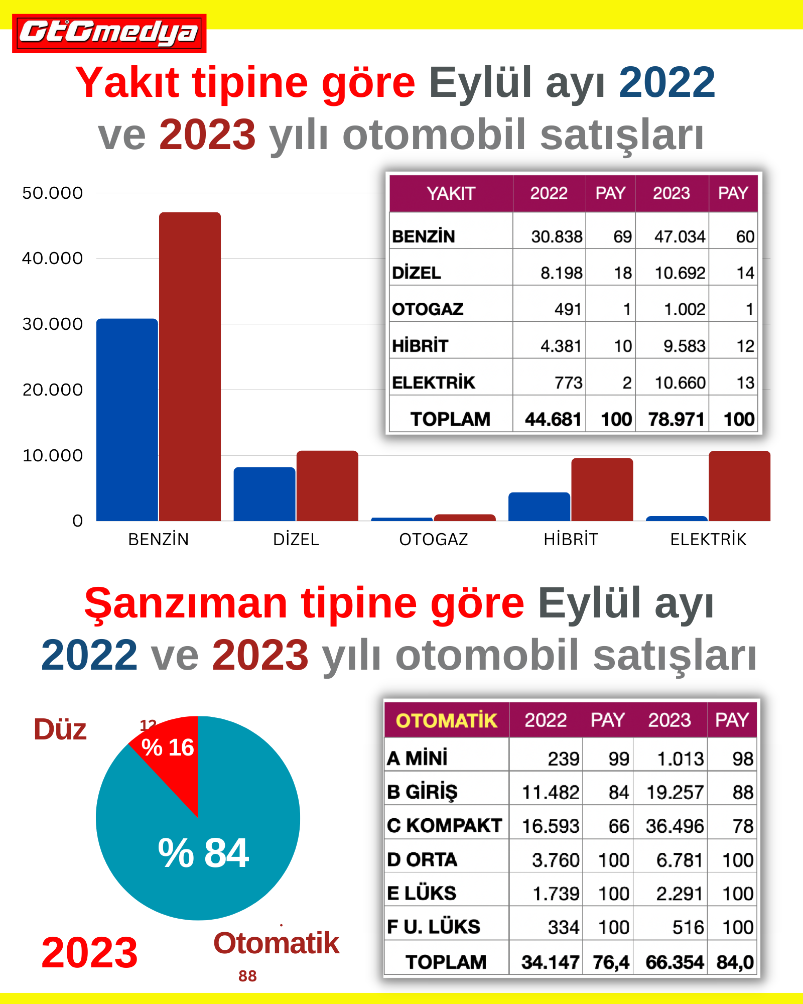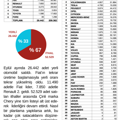 Eylül ayında 26.442 adet yerli otomobil satıldı. Fiat’ın tekrar üretime başlamasıyla yerli oranı tekrar yükselmiş oldu. 11.490 adetle Fiat lider, 7.850 adetle Renault 2. geldi. 52.529 adet satılan ithaller arasında Çinli marka Chery yine tüm listeyi alt üst ederek liderliğini devam ettirdi. Nasıl bir planlama yaptılarsa artık, bu kadar çok satacaklarını düşünerek ona göre araç getirmişler. 5.636 adet satan Chery birinci iken onu VW ve Tesla takip etti.