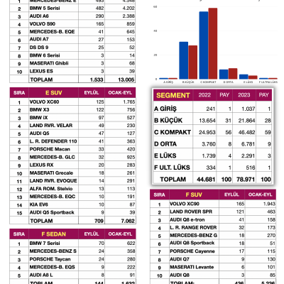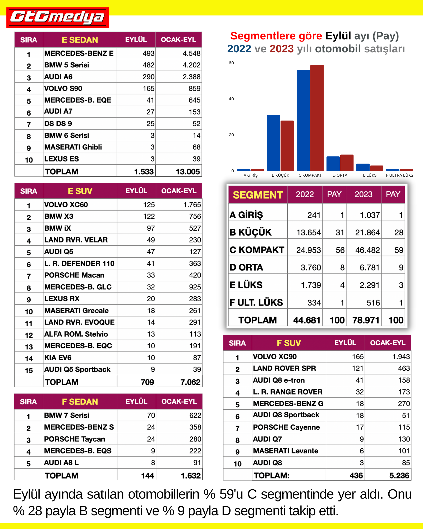 Eylül ayında satılan otomobillerin % 59'u C segmentinde yer aldı. Onu % 28 payla B segmenti ve % 9 payla D segmenti takip etti.