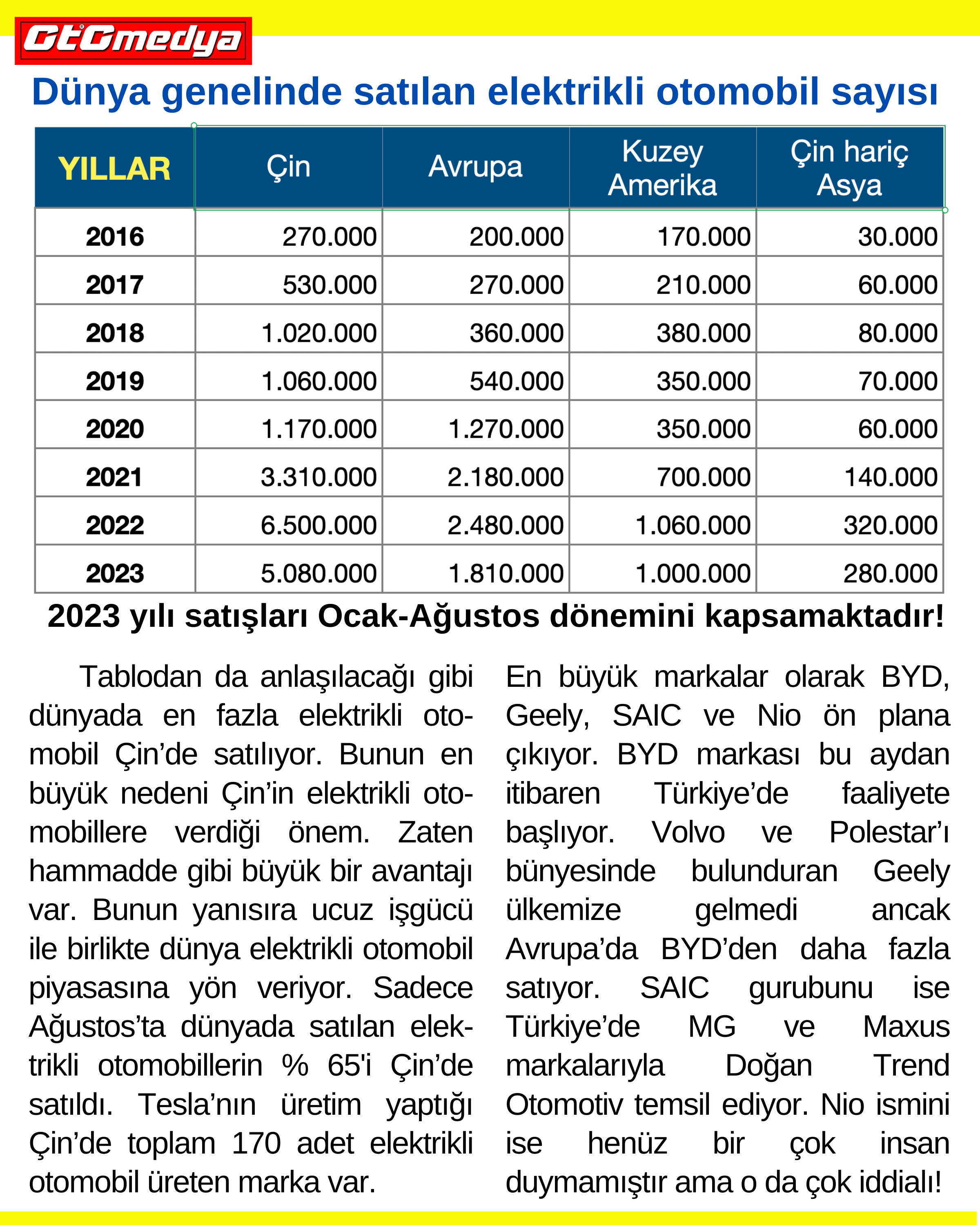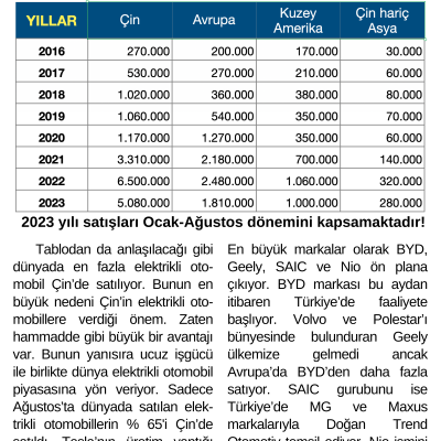 Dünyada en fazla elektrikli otomobil Çin’de satılıyor. Bunun en büyük nedeni Çin’in elektrikli otomobillere verdiği önem. Zaten hammadde gibi büyük bir avantajı var. Bunun yanısıra ucuz işgücü ile birlikte dünya elektrikli otomobil piyasasına yön veriyor.