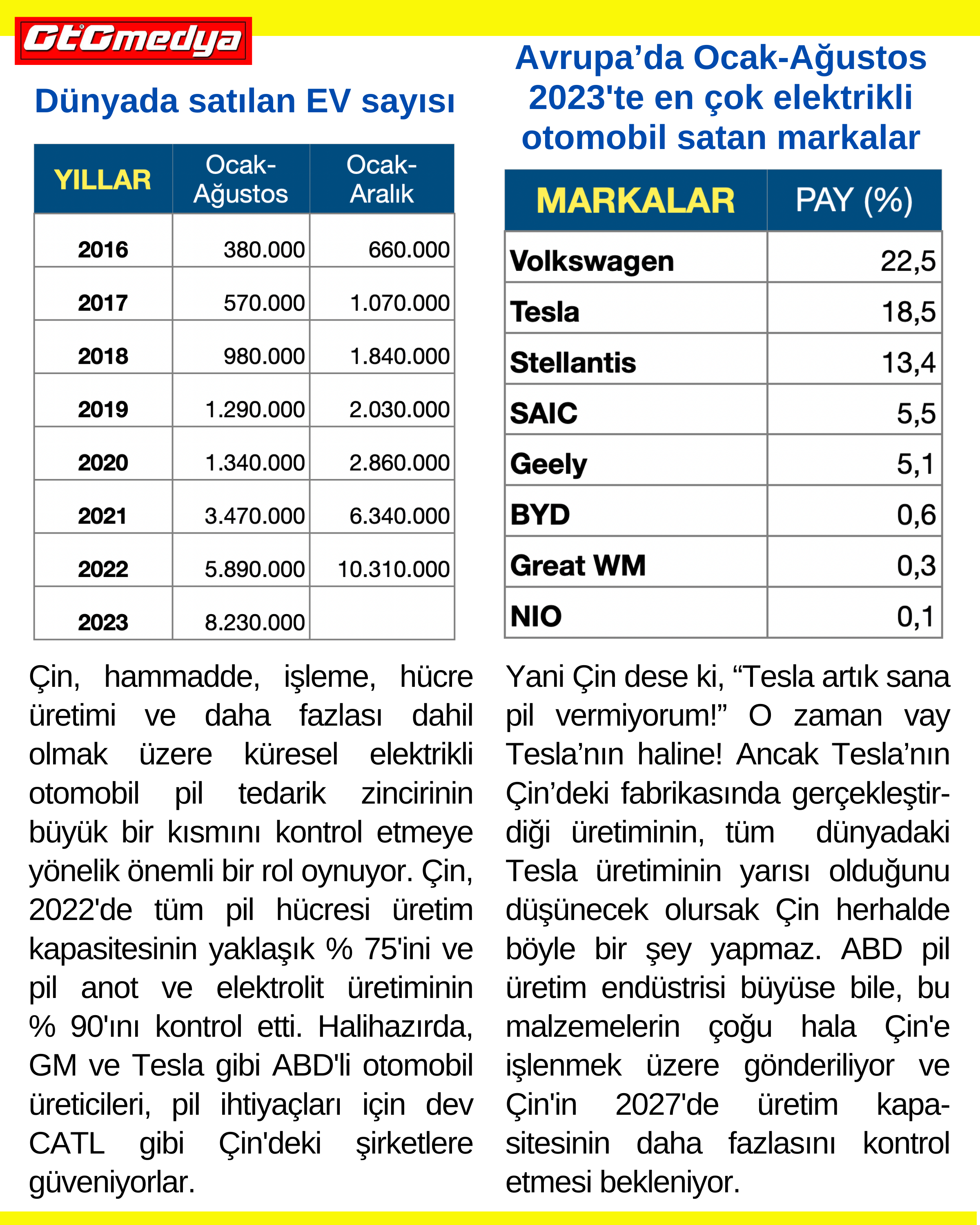 Dünya geneline bakarsak; oransal olarak en fazla elektrikli otomobil % 72 oranıyla Norveç’te satılıyor. Sonrasında % 28 ile Çin geliyor. Almanya % 20 ile üçüncü sırada. ABD de bu konuda biraz gerilerde. (Tesla olmasına karşın!) Avrupa özeline bakacak olursak; En fazla satış yapan markanın (hala Türkiye’de satış yapmayan!) Volkswagen olduğunu görüyoruz. Tesla ikinci sırada yer alırken, Stellantis markası ise üçüncü ve Çinli SAIC (MG) dördüncü sırada.