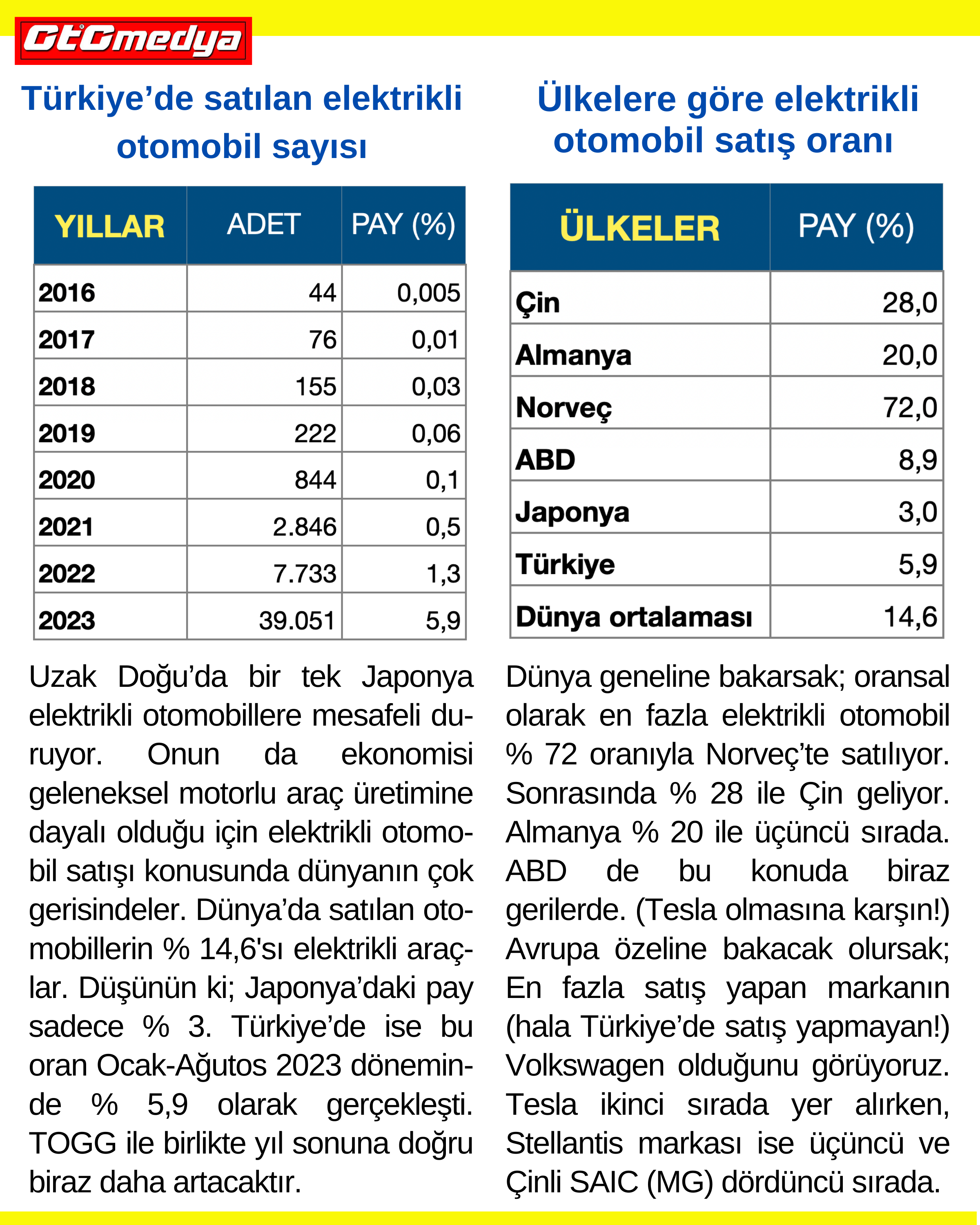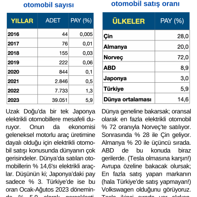 Uzak Doğu’da bir tek Japonya elektrikli otomobillere mesafeli duruyor. Onun da ekonomisi geleneksel motorlu araç üretimine dayalı olduğu için elektrikli otomobil satışı konusunda dünyanın çok gerisindeler. Dünya’da satılan otomobillerin % 14,6'sı elektrikli araçlar. Düşünün ki; Japonya’daki pay sadece % 3. Türkiye’de ise bu oran Ocak-Ağutos 2023 döneminde % 5,9 olarak gerçekleşti. TOGG ile birlikte yıl sonuna doğru biraz daha artacaktır.