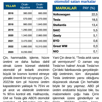Yani Çin dese ki, “Tesla artık sana pil vermiyorum!” O zaman vay Tesla’nın haline! Ancak Tesla’nın Çin’deki fabrikasında gerçekleştirdiği üretiminin, tüm dünyadaki Tesla üretiminin yarısı olduğunu düşünecek olursak Çin herhalde böyle bir şey yapmaz. ABD pil üretim endüstrisi büyüse bile, bu malzemelerin çoğu hala Çin'e işlenmek üzere gönderiliyor ve Çin'in 2027'de üretim kapasitesinin daha fazlasını kontrol etmesi bekleniyor.