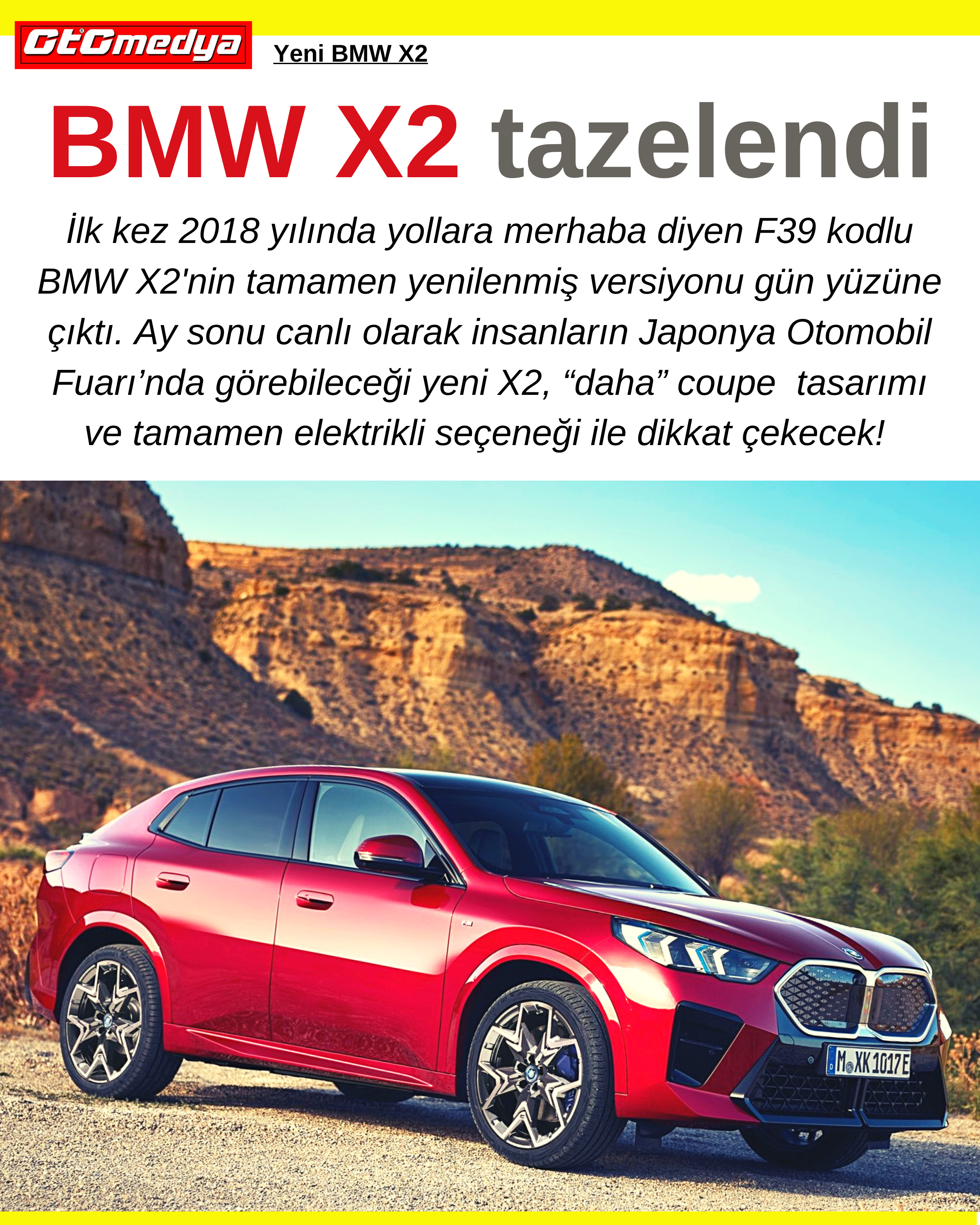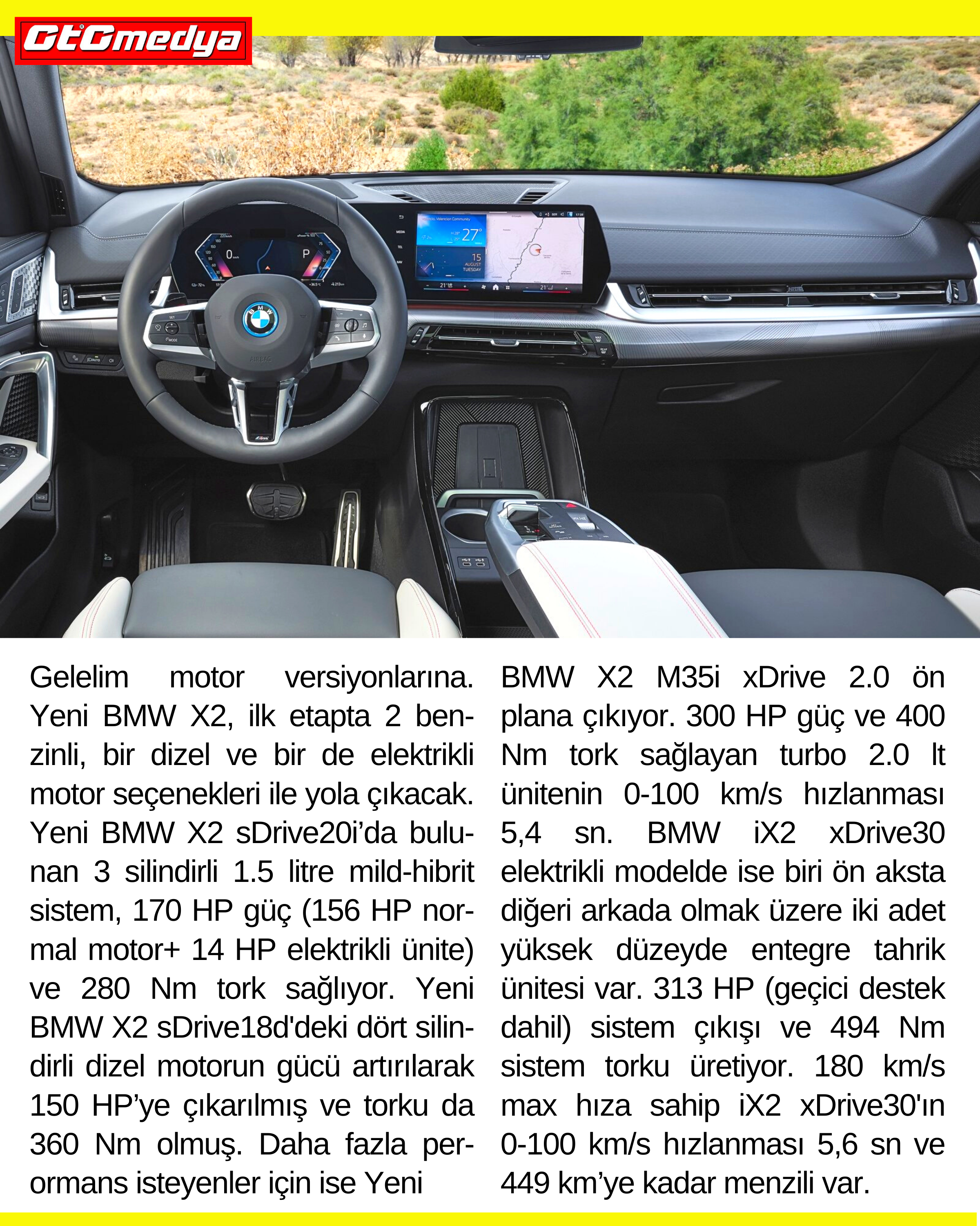 Gelelim motor versiyonlarına. Yeni BMW X2, ilk etapta 2 ben-zinli, bir dizel ve bir de elektrikli motor seçenekleri ile yola çıkacak. Yeni BMW X2 sDrive20i’da bulunan 3 silindirli 1.5 litre mild-hibrit sistem, 170 HP güç (156 HP normal motor+ 14 HP elektrikli ünite) ve 280 Nm tork sağlıyor. Yeni BMW X2 sDrive18d'deki dört silin-dirli dizel motorun gücü artırılarak 150 HP’ye çıkarılmış ve torku da 360 Nm olmuş. Daha fazla performans isteyenler için ise Yeni BMW X2 M35i xDrive 2.0 ön plana çıkıyor. 300 HP güç ve 400 Nm tork sağlayan turbo 2.0 lt ünitenin 0-100 km/s hızlanması 5,4 sn. BMW iX2 xDrive30 elektrikli modelde ise biri ön aksta diğeri arkada olmak üzere iki adet yüksek düzeyde entegre tahrik ünitesi var. 313 HP (geçici destek dahil) sistem çıkışı ve 494 Nm sistem torku üretiyor. 180 km/s max hıza sahip iX2 xDrive30'ın 0-100 km/s hızlanması 5,6 sn ve 449 km’ye kadar menzili var.