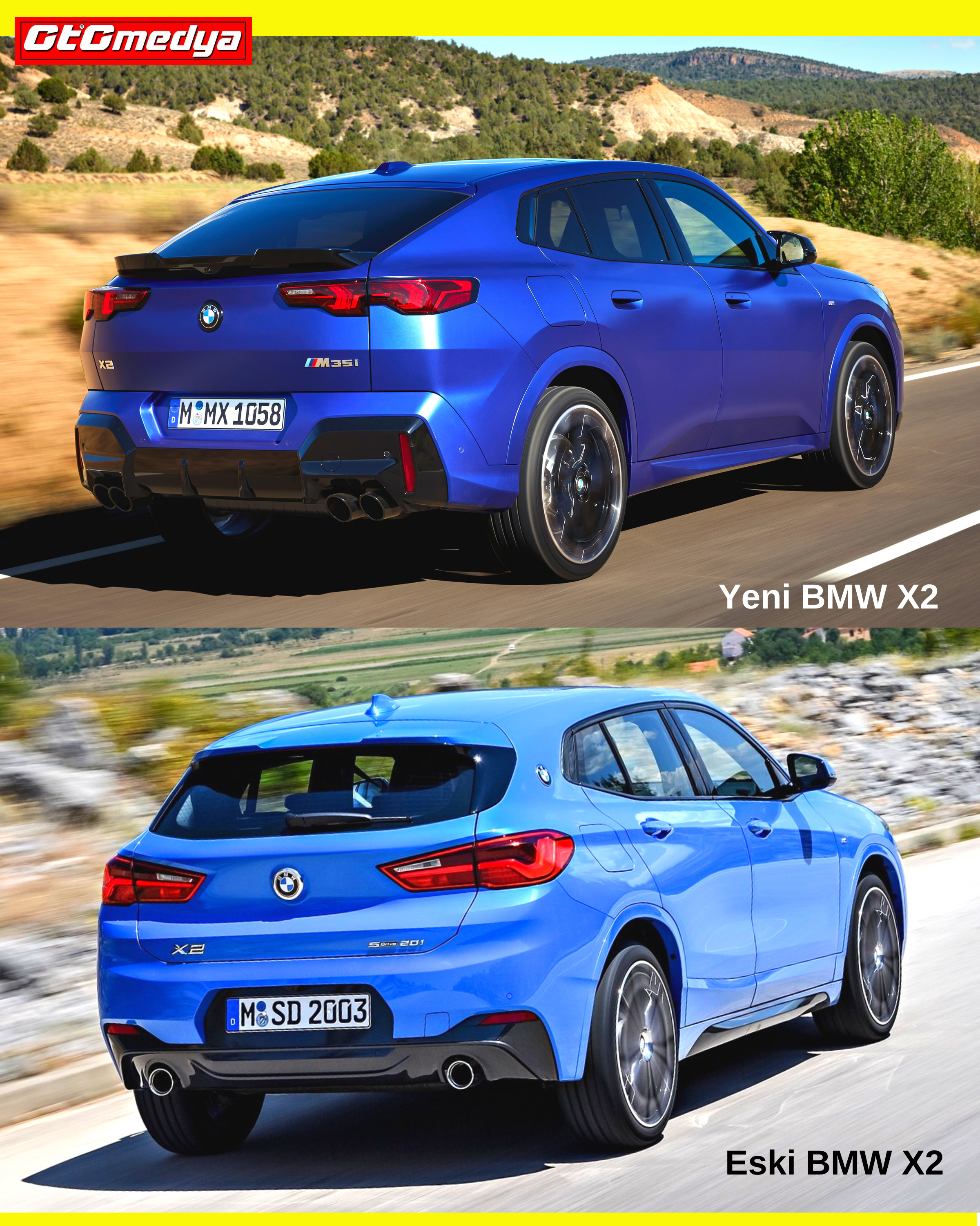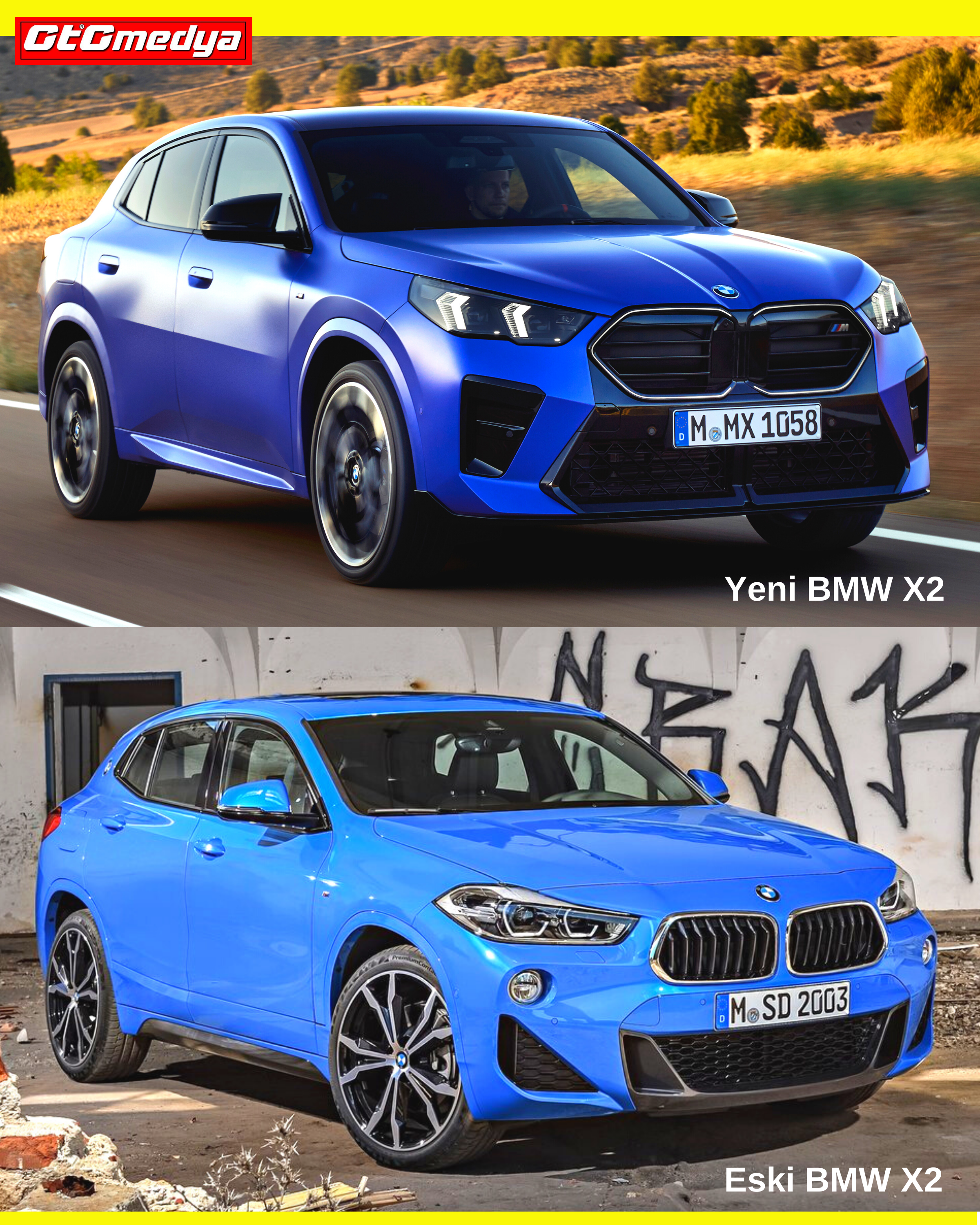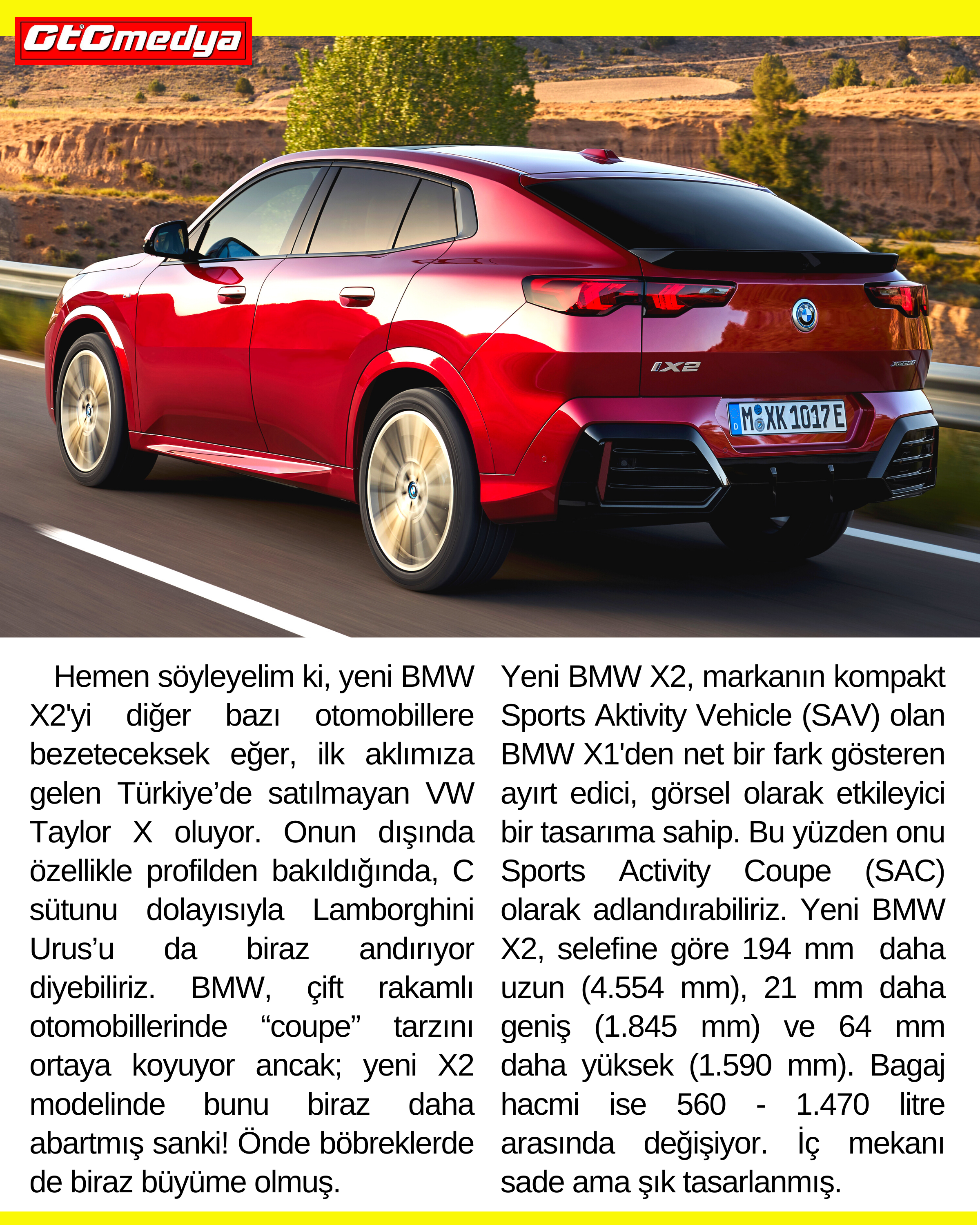 Hemen söyleyelim ki, yeni BMW X2'yi diğer bazı otomobillere bezeteceksek eğer, ilk aklımıza gelen Türkiye’de satılmayan VW Taylor X oluyor. Onun dışında özellikle profilden bakıldığında, C sütunu dolayısıyla Lamborghini Urus’u da biraz andırıyor diyebiliriz. BMW, çift rakamlı otomobillerinde “coupe” tarzını ortaya koyuyor ancak; yeni X2 modelinde bunu biraz daha abartmış sanki! Önde böbreklerde de biraz büyüme olmuş. Yeni BMW X2, selefine göre 194 mm daha uzun (4.554 mm), 21 mm daha geniş (1.845 mm) ve 64 mm daha yüksek (1.590 mm). Bagaj hacmi ise 560 - 1.470 litre arasında değişiyor. İç mekanı sade ama şık tasarlanmış.