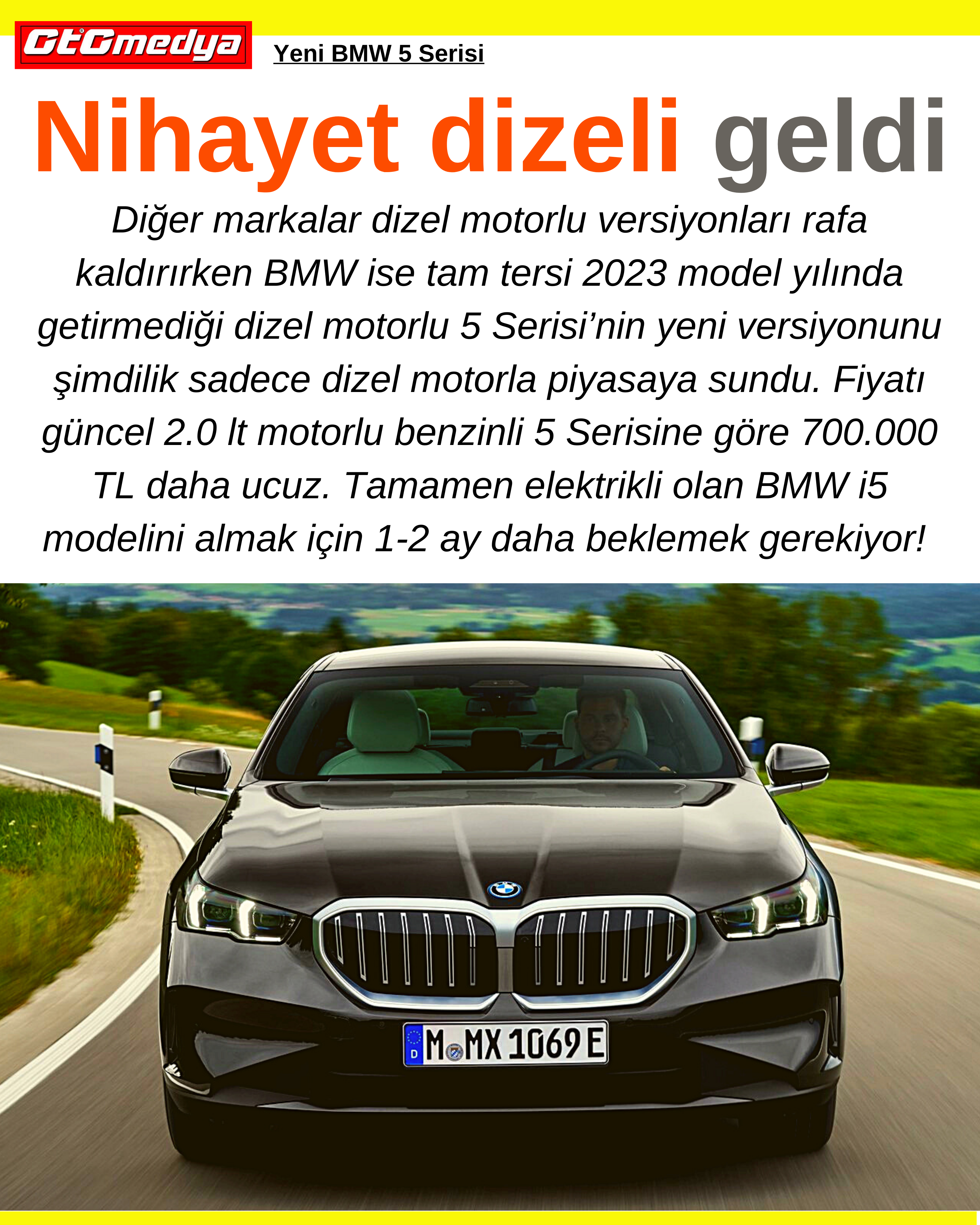 Diğer markalar dizel motorlu versiyonları rafa kaldırırken BMW ise tam tersi 2023 model yılında getirmediği dizel motorlu 5 Serisi’nin yeni versiyonunu şimdilik sadece dizel motorla piyasaya sundu. Fiyatı güncel 2.0 lt motorlu benzinli 5 Serisine göre 700.000 TL daha ucuz. Tamamen elektrikli olan BMW i5 modelini almak için 1-2 ay daha beklemek gerekiyor!