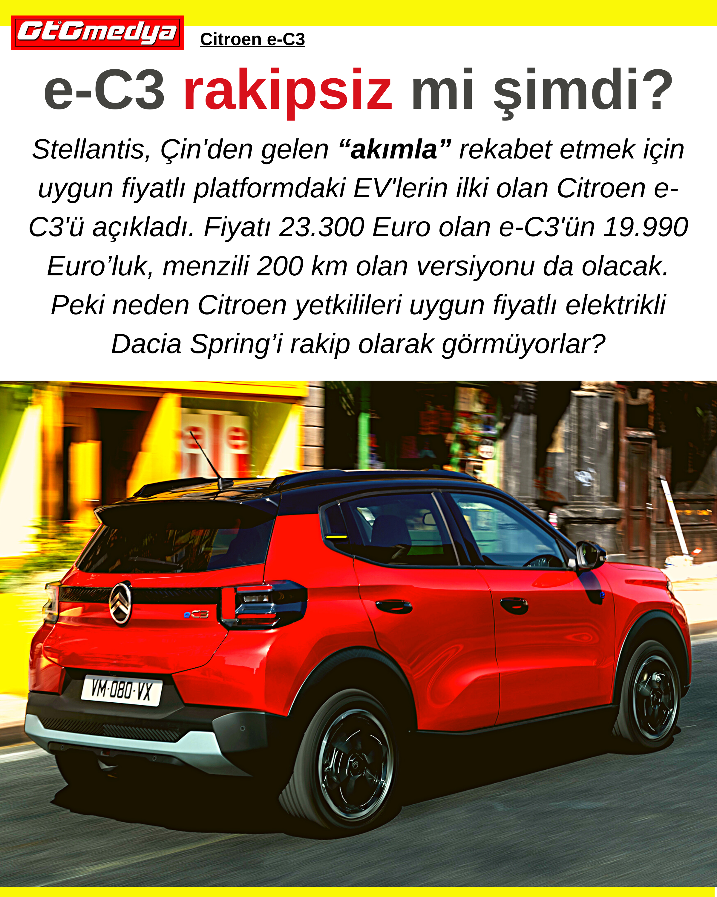 Stellantis, Çin'den gelen “akımla” rekabet etmek için uygun fiyatlı platformdaki EV'lerin ilki olan Citroen e-C3'ü açıkladı. Fiyatı 23.300 Euro olan e-C3'ün 19.990 Euro’luk, menzili 200 km olan versiyonu da olacak. Peki neden Citroen yetkilileri uygun fiyatlı elektrikli Dacia Spring’i rakip olarak görmüyorlar?