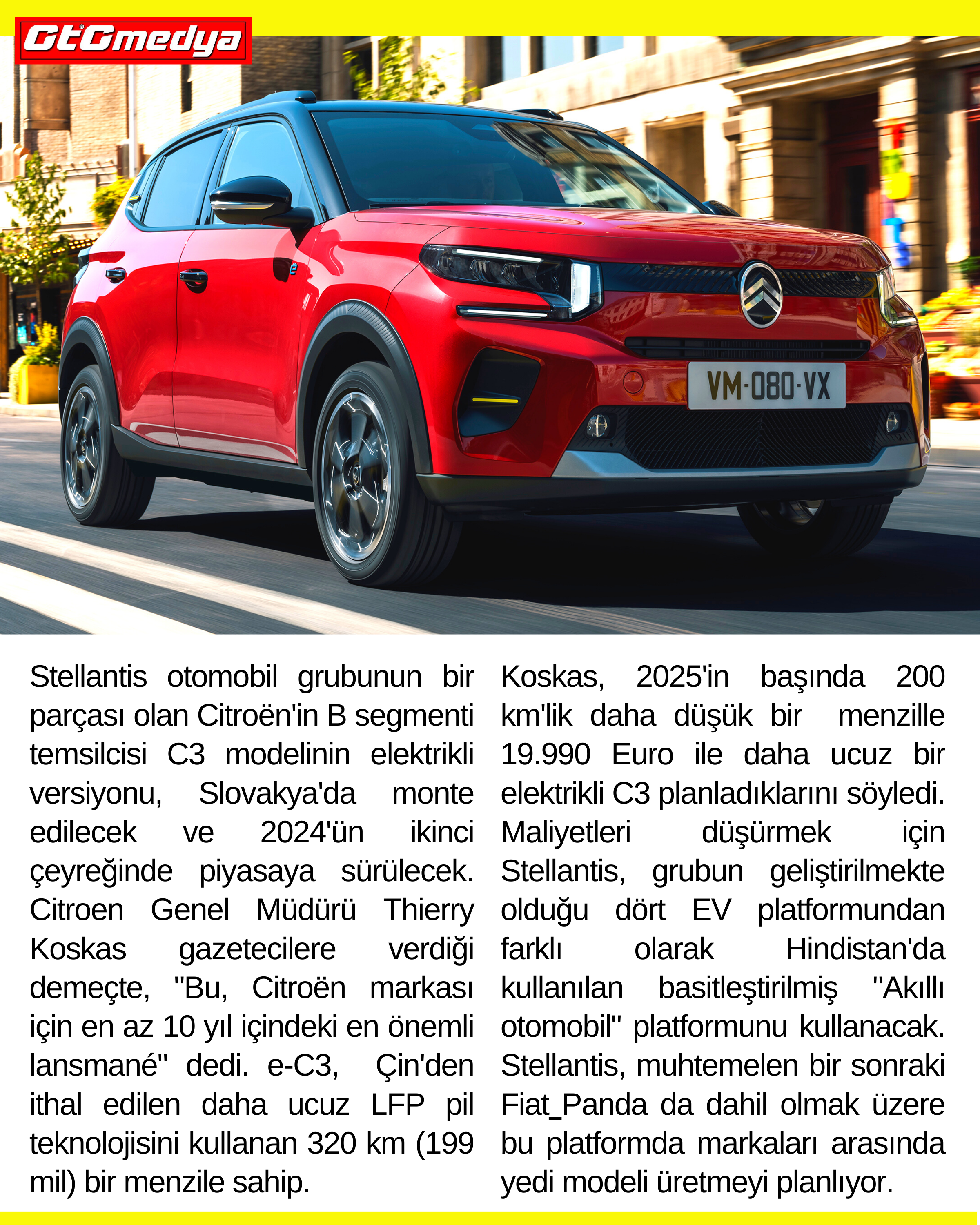 Stellantis otomobil grubunun bir parçası olan Citroën'in B segmenti temsilcisi C3 modelinin elektrikli versiyonu, Slovakya'da monte edilecek ve 2024'ün ikinci çeyreğinde piyasaya sürülecek. Citroen Genel Müdürü Thierry Koskas gazetecilere verdiği demeçte, "Bu, Citroën markası için en az 10 yıl içindeki en önemli lansmanı" dedi. e-C3,  Çin'den ithal edilen daha ucuz LFP pil teknolojisini kullanan 320 km (199 mil) bir menzile sahip.