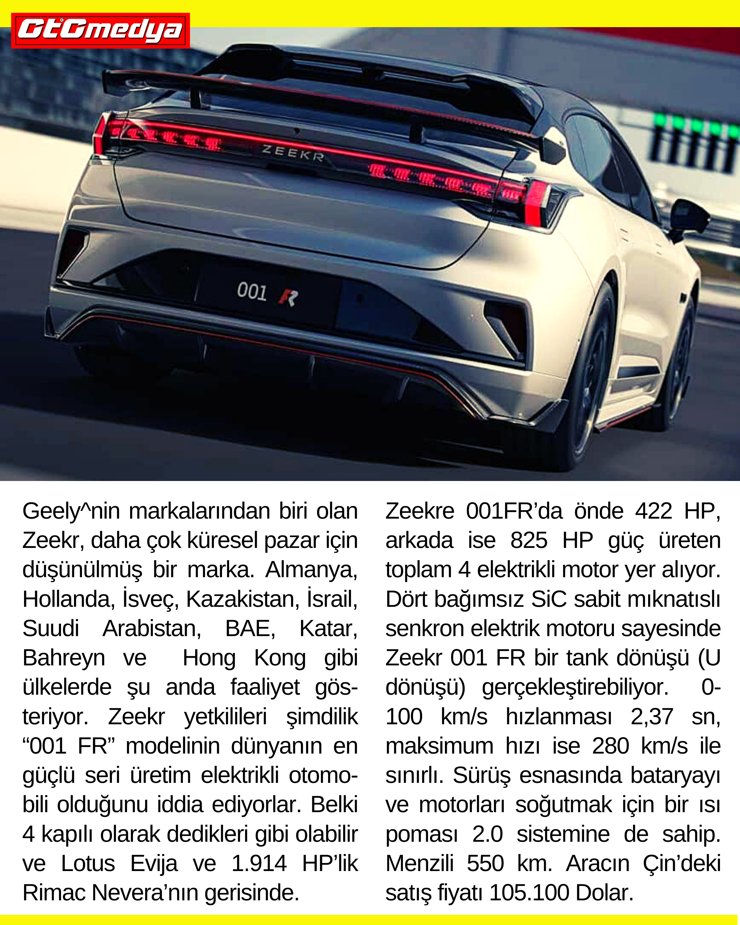 Geely^nin markalarından biri olan Zeekr, daha çok küresel pazar için düşünülmüş bir marka. Almanya, Hollanda, İsveç, Kazakistan, İsrail, Suudi Arabistan, BAE, Katar, Bahreyn ve Hong Kong gibi ülkelerde şu anda faaliyet gösteriyor. Zeekr yetkilileri şimdilik “001 FR” modelinin dünyanın en güçlü seri üretim elektrikli otomobili olduğunu iddia ediyorlar. Belki 4 kapılı olarak dedikleri gibi olabilir ve Lotus Evija ve 1.914 HP’lik Rimac Nevera’nın gerisinde.