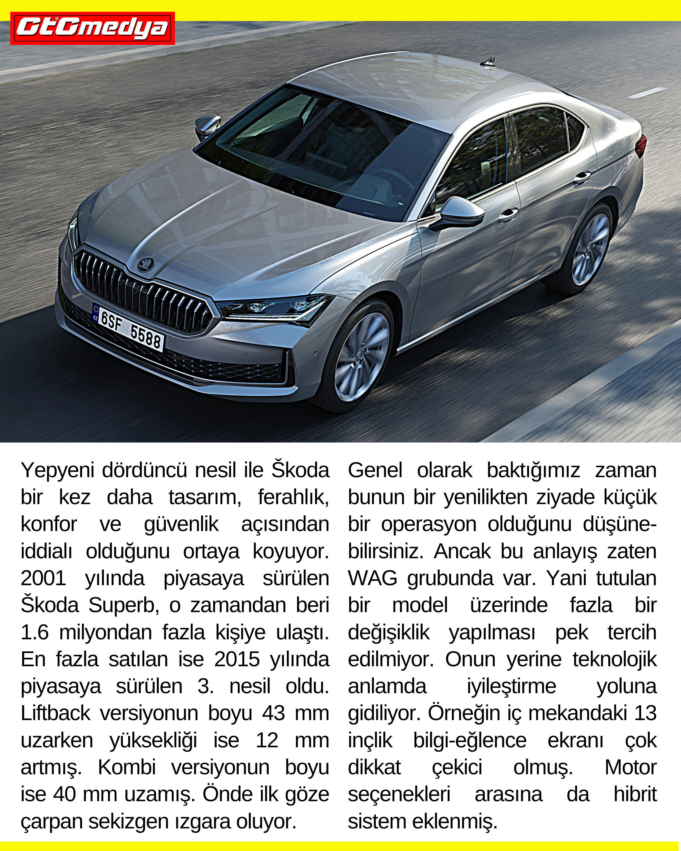 Yepyeni dördüncü nesil ile Škoda bir kez daha tasarım, ferahlık, konfor ve güvenlik açısından iddialı olduğunu ortaya koyuyor. 2001 yılında piyasaya sürülen Škoda Superb, o zamandan beri 1.6 milyondan fazla kişiye ulaştı. En fazla satılan ise 2015 yılında piyasaya sürülen 3. nesil oldu. Liftback versiyonun boyu 43 mm uzarken yüksekliği ise 12 mm artmış. Kombi versiyonun boyu ise 40 mm uzamış. Önde ilk göze çarpan sekizgen ızgara oluyor.