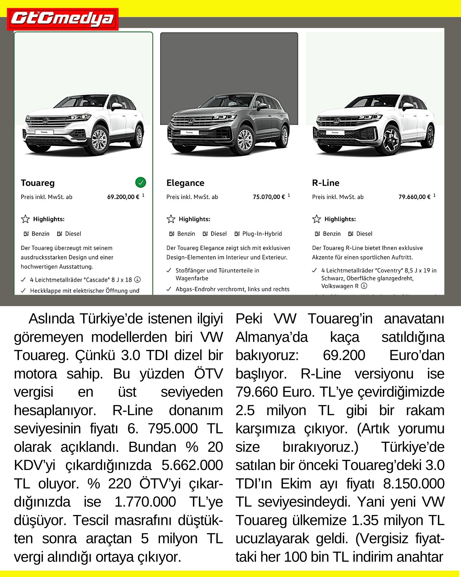 Aslında Türkiye’de istenen ilgiyi göremeyen modellerden biri VW Touareg. Çünkü 3.0 TDI dizel bir motora sahip. Bu yüzden ÖTV vergisi en üst seviyeden hesaplanıyor. R-Line donanım seviyesinin fiyatı 7.095.000 TL olarak açıklandı. Bundan % 20 KDV’yi çıkardığınızda 5.912.000 TL oluyor. % 220 ÖTV’yi çıkardığınızda ise 1.870.000 TL’ye düşüyor. Tescil masrafını düştükten sonra araçtan 5.225.000 TL vergi alındığı ortaya çıkıyor.