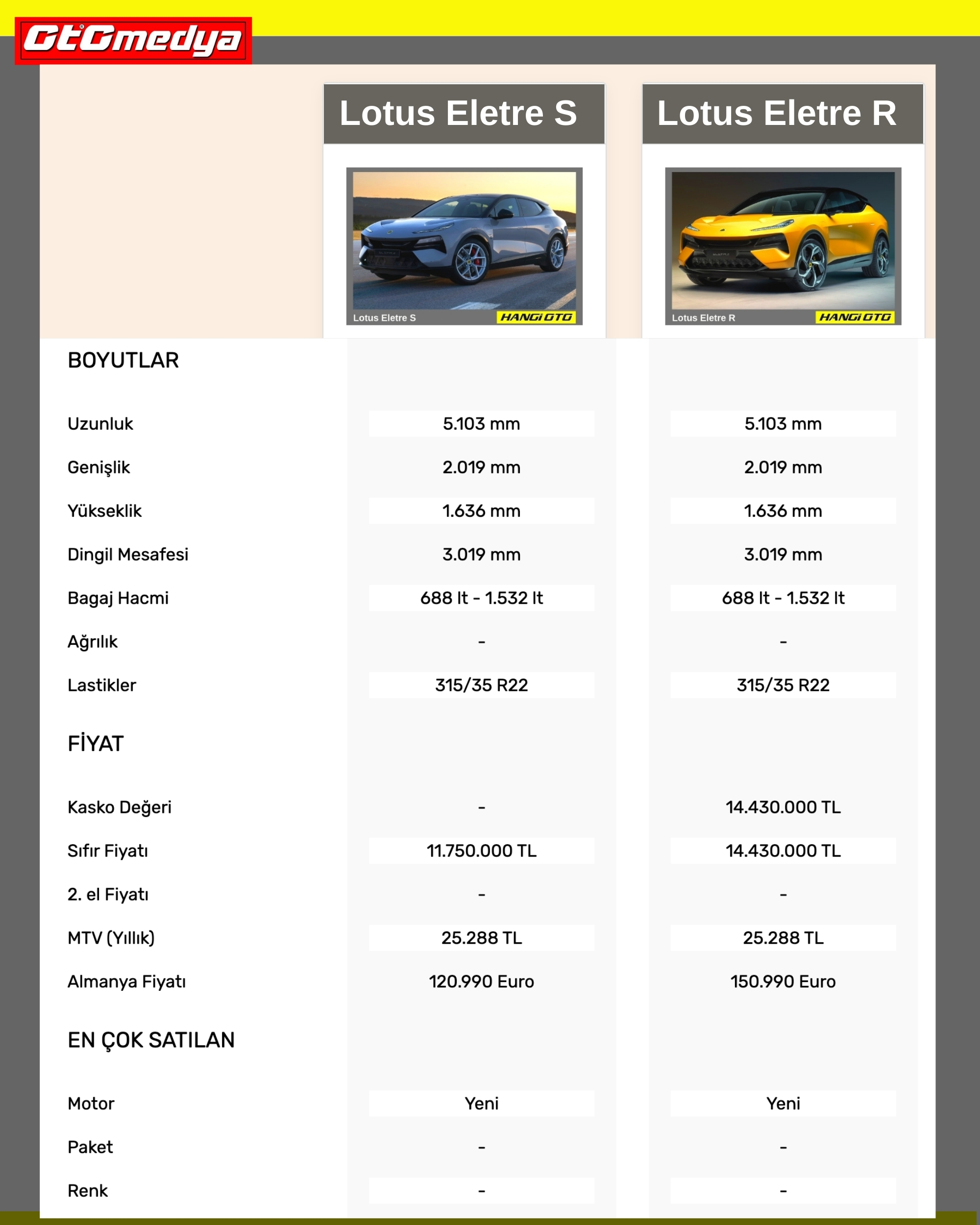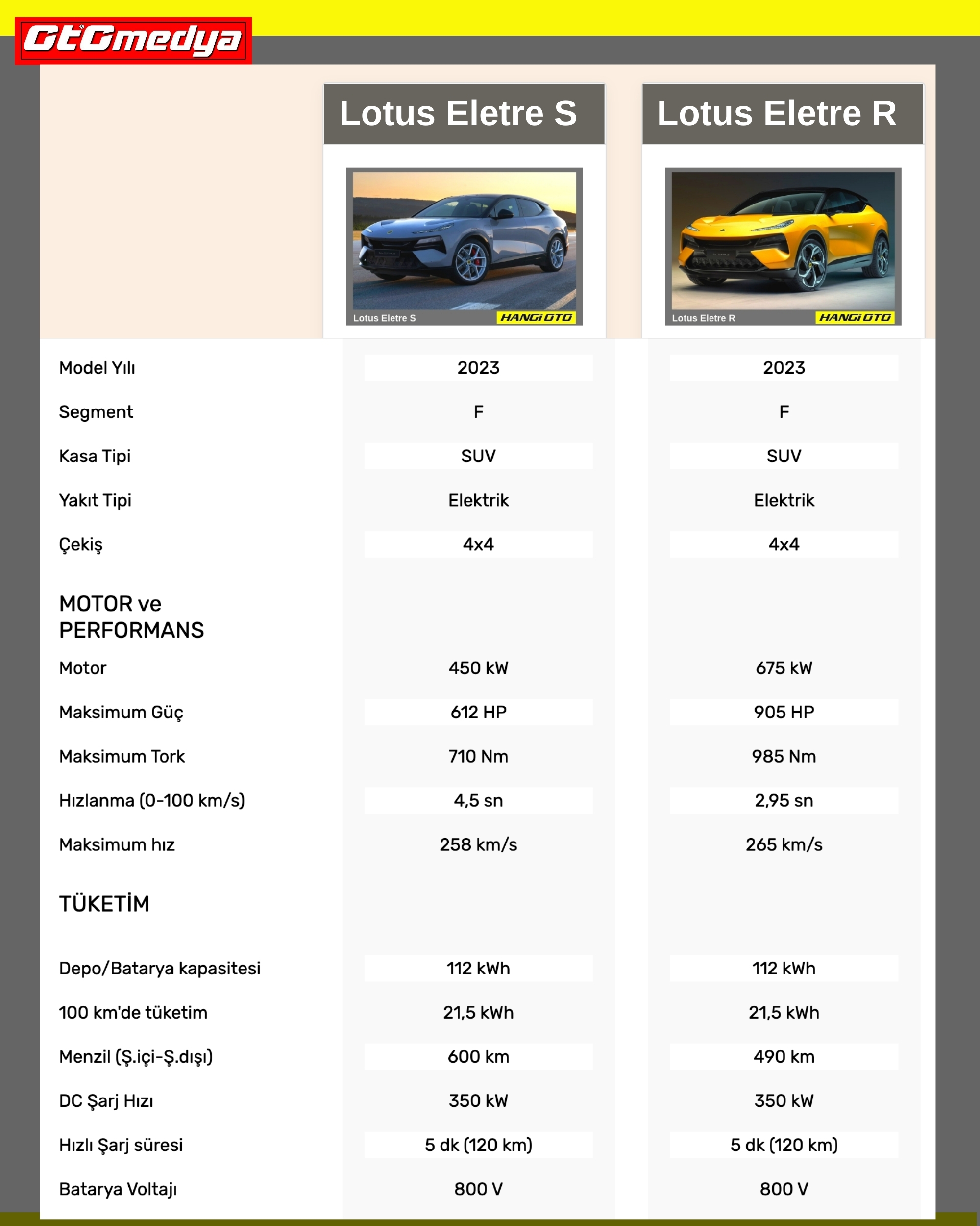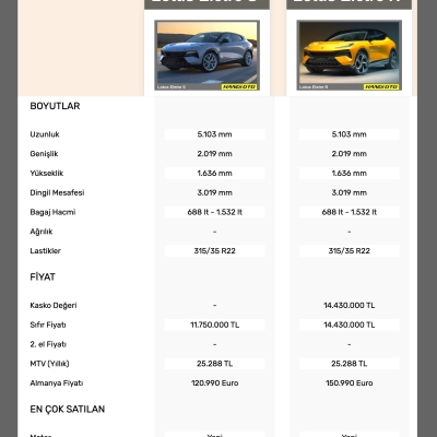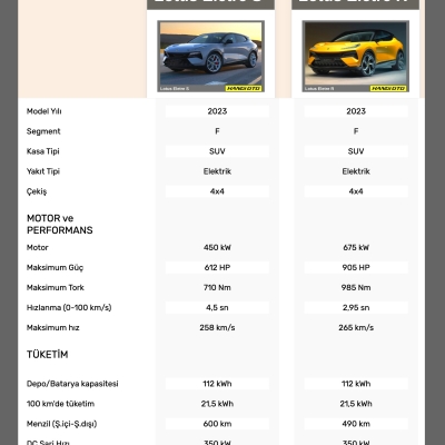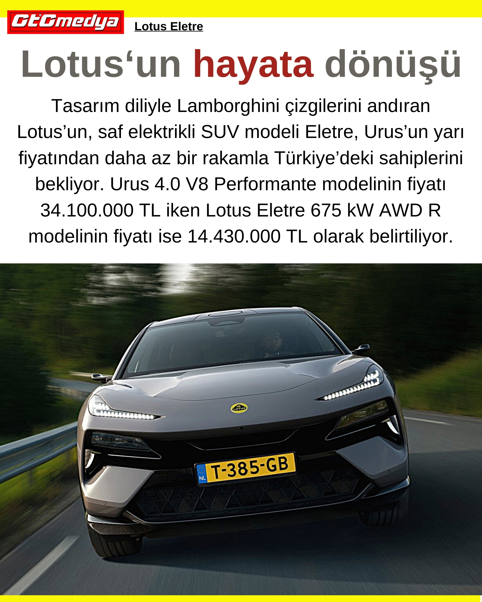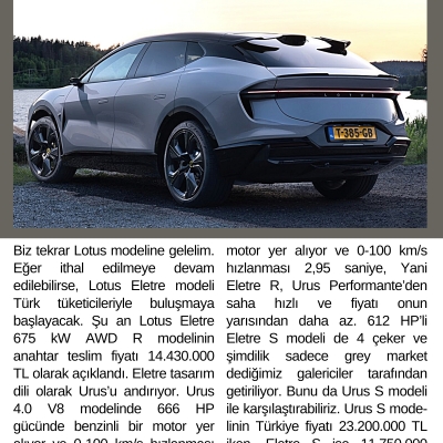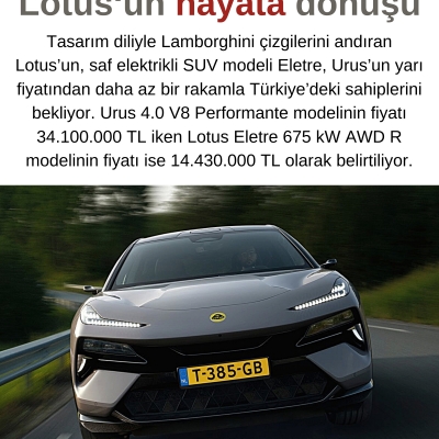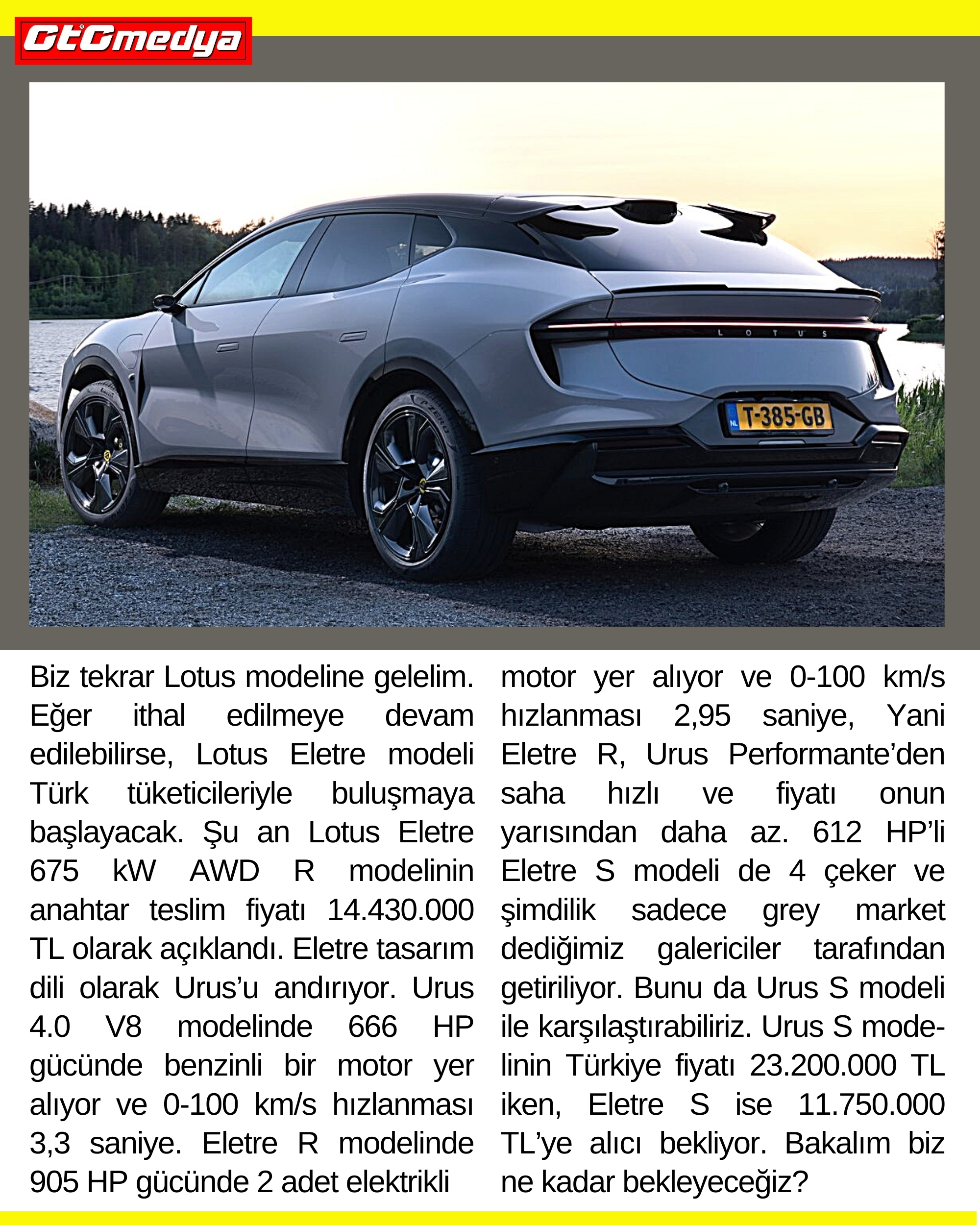 Biz tekrar Lotus modeline gelelim. Eğer ithal edilmeye devam edilebilirse, Lotus Eletre modeli Türk tüketicileriyle buluşmaya başlayacak. Şu an Lotus Eletre 675 kW AWD R modelinin anahtar teslim fiyatı 14.430.000 TL olarak açıklandı. Eletre tasarım dili olarak Urus’u andırıyor. Urus 4.0 V8 modelinde 666 HP gücünde benzinli bir motor yer alıyor ve 0-100 km/s hızlanması 3,3 saniye. Eletre R modelinde 905 HP gücünde 2 adet elektrikli motor yer alıyor ve 0-100 km/s hızlanması 2,95 saniye, Yani Eletre R, Urus Performante’den saha hızlı ve fiyatı onun yarısından daha az. 612 HP’li Eletre S modeli de 4 çeker ve şimdilik sadece grey market dediğimiz galericiler tarafından getiriliyor. Bunu da Urus S modeli ile karşılaştırabiliriz. Urus S mode-linin Türkiye fiyatı 23.200.000 TL iken, Eletre S ise 11.750.000 TL’ye alıcı bekliyor. Bakalım biz alabilmek ne kadar bekleyeceğiz?