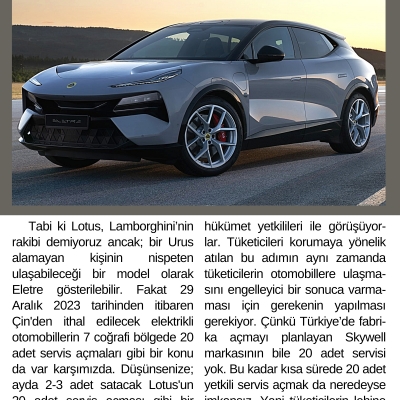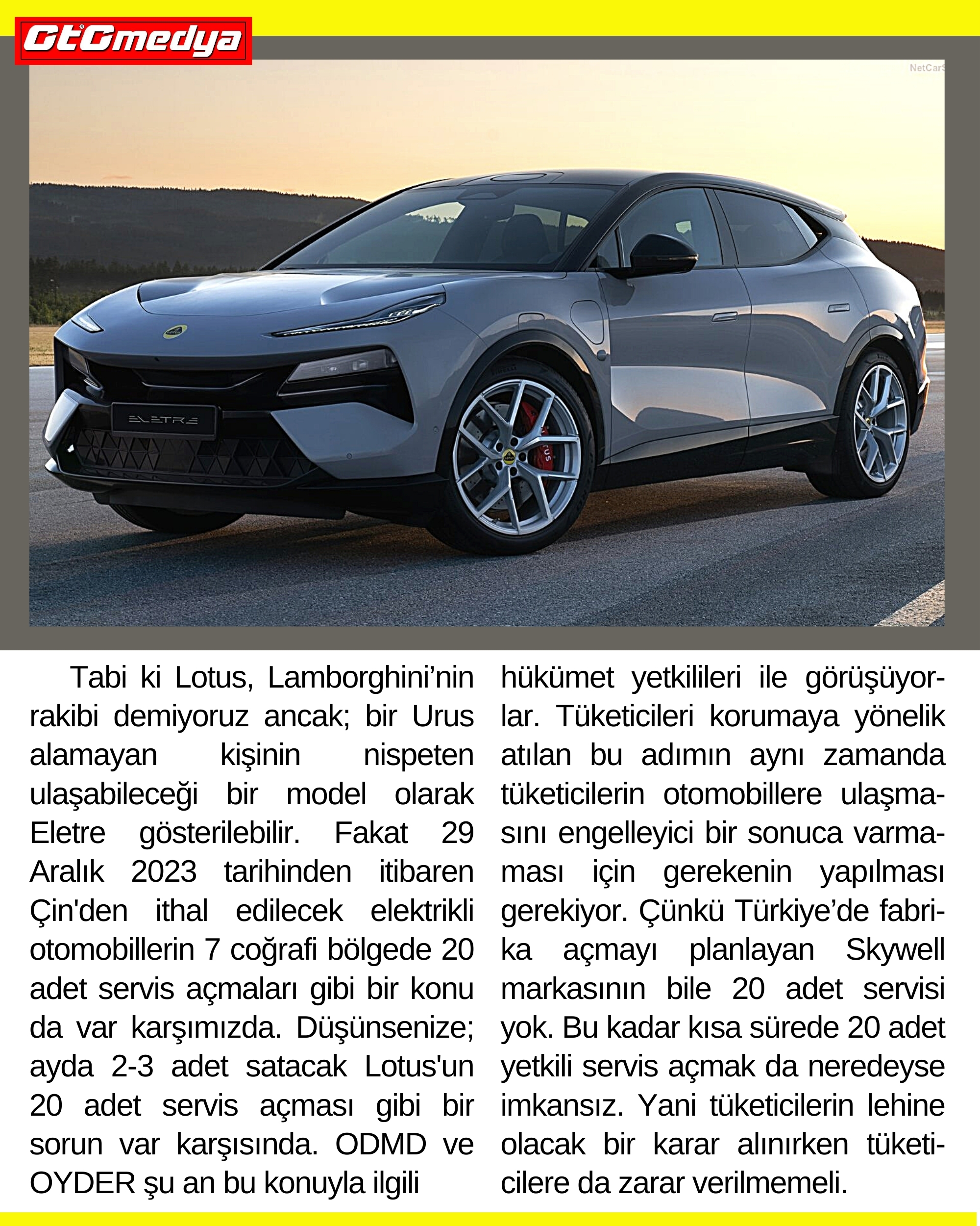 Tabi ki Lotus, Lamborghini’nin rakibi demiyoruz ancak; bir Urus alamayan kişinin nispeten ulaşabileceği bir model olarak Eletre gösterilebilir. Fakat 29 Aralık 2023 tarihinden itibaren Çin'den ithal edilecek elektrikli otomobillerin 7 coğrafi bölgede 20 adet servis açmaları gibi bir konu da var karşımızda. Düşünsenize; ayda 2-3 adet satacak Lotus'un 20 adet servis açması gibi bir sorun var karşısında. ODMD ve OYDER şu an bu konuyla ilgili hükümet yetkilileri ile görüşüyorlar. Tüketicileri korumaya yönelik atılan bu adımın aynı zamanda tüketicilerin otomobillere ulaşmasını engelleyici bir sonuca varmaması için gerekenin yapılması gerekiyor. Çünkü Türkiye’de fabrika açmayı planlayan Skywell markasının bile 20 adet servisi yok. Bu kadar kısa sürede 20 adet yetkili servis açmak da neredeyse imkansız. Yani tüketicilerin lehine olacak bir karar alınırken tüketicilere da zarar verilmemeli.