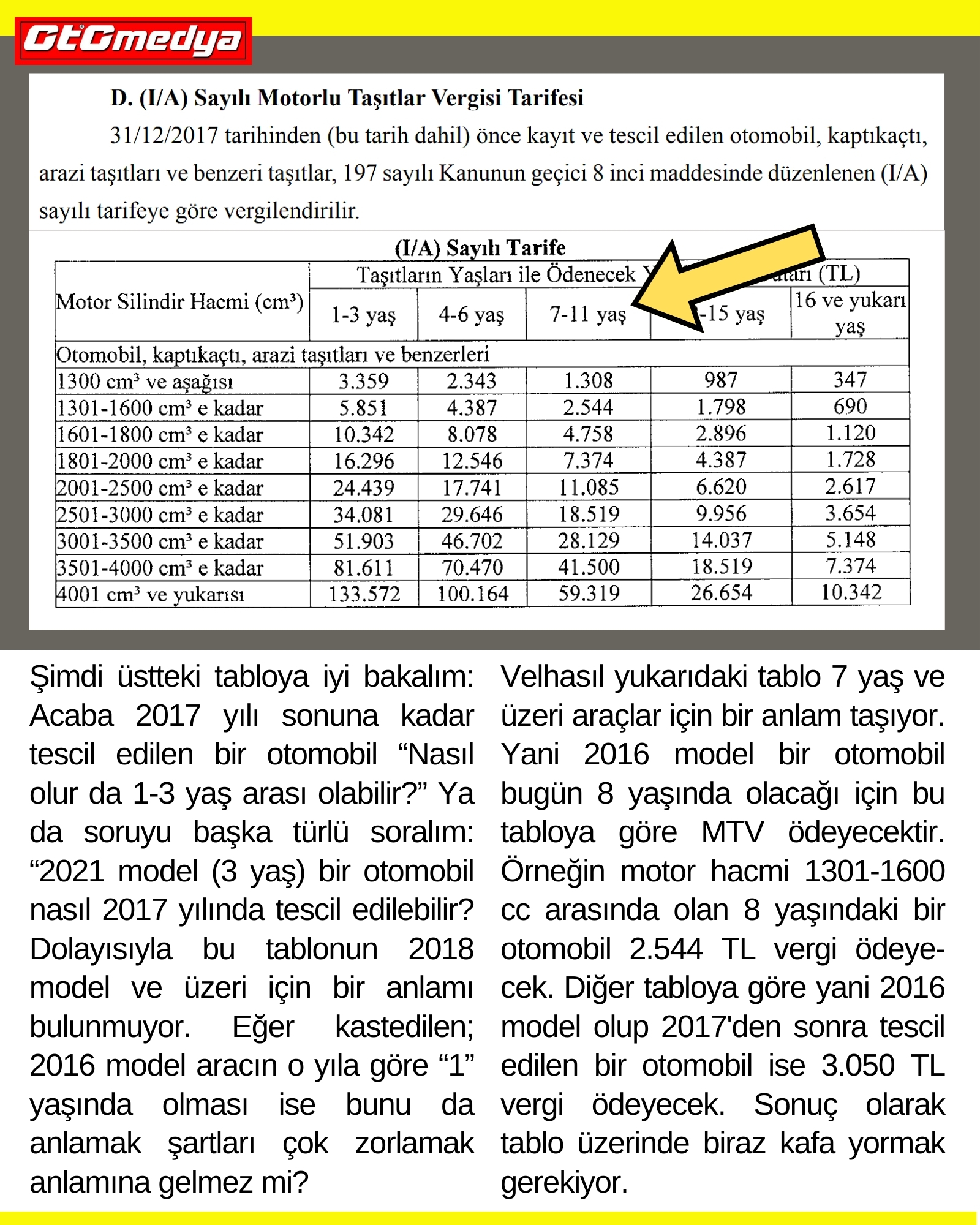 Velhasıl yukarıdaki tablo 7 yaş ve üzeri araçlar için bir anlam taşıyor. Yani 2016 model bir otomobil bugün 8 yaşında olacağı için bu tabloya göre MTV ödeyecektir. Örneğin motor hacmi 1301-1600 cc arasında olan 8 yaşındaki bir otomobil 2.544 TL vergi ödeyecek. Diğer tabloya göre yani 2016 model olup 2017'den sonra tescil edilen bir otomobil ise 3.050 TL vergi ödeyecek. Sonuç olarak tablo üzerinde biraz kafa yormak gerekiyor.