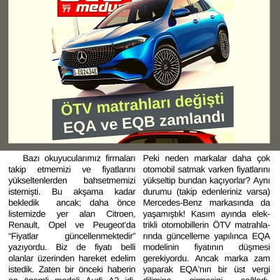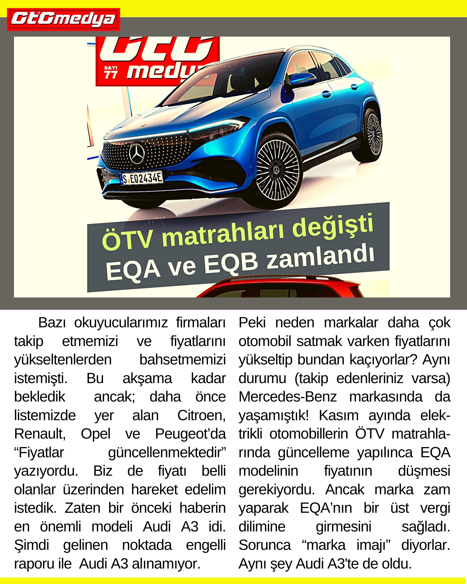 Peki neden markalar daha çok otomobil satmak varken fiyatlarını yükseltip bundan kaçıyorlar? Aynı durumu (takip edenleriniz varsa) Mercedes-Benz markasında da yaşamıştık! Kasım ayında elektrikli otomobillerin ÖTV matrahlarında güncelleme yapılınca EQA modelinin fiyatının düşmesi gerekiyordu. Ancak marka zam yaparak EQA’nın bir üst vergi dilimine girmesini sağladı ve fiyatı yükseldi. Sorunca “marka imajı” diyorlar. Aynı şey Audi A3'te de oldu.