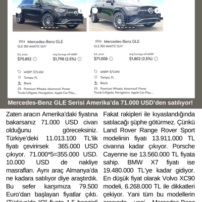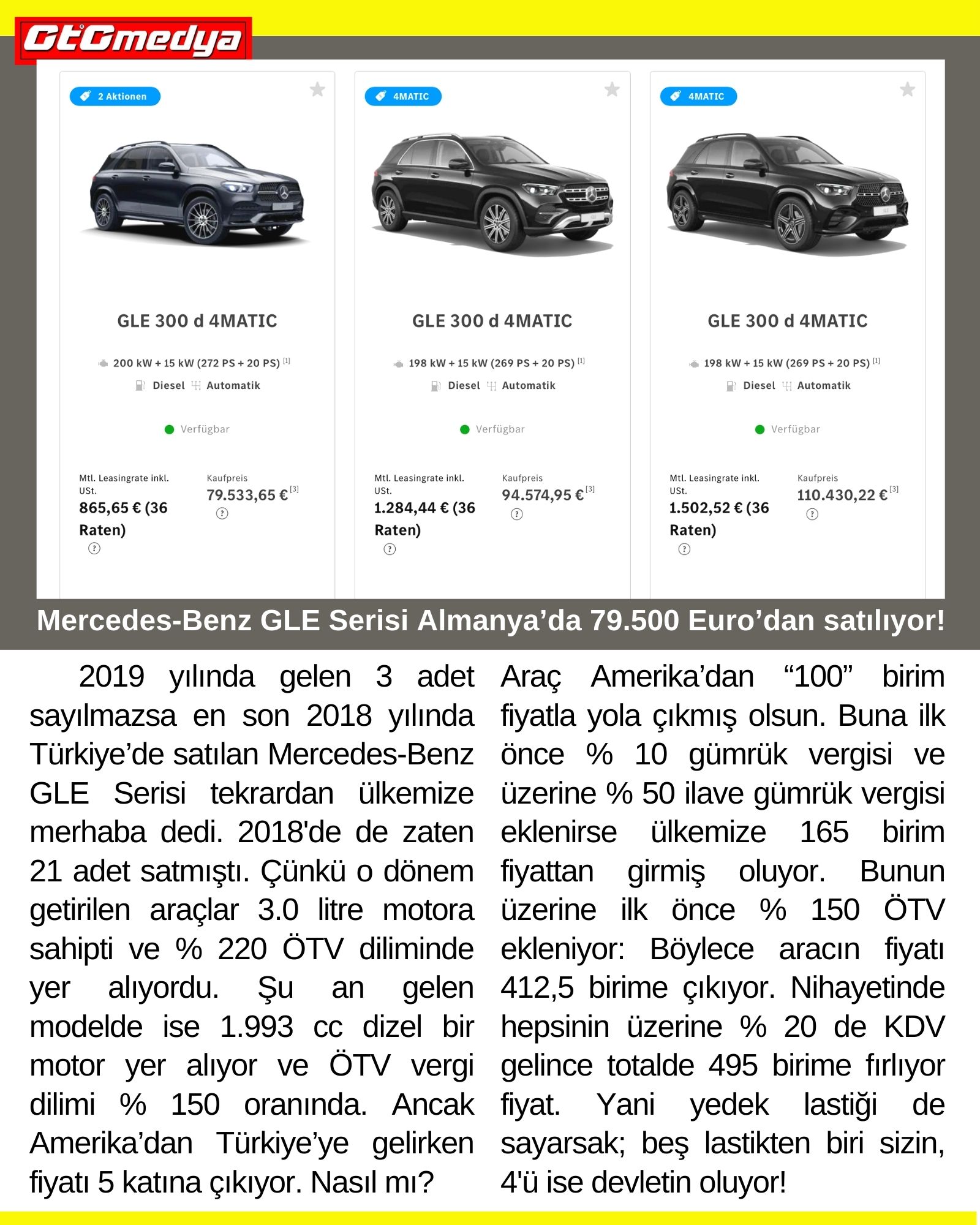 Zaten aracın Amerika’daki fiyatına bakarsanız 71.000 USD civarı olduğunu göreceksiniz. Türkiye’deki 11.013.100 TL’lik fiyatı çevirirsek 365.000 USD çıkıyor. 71.000*5=355.000 USD. 10.000 USD de nakliye masrafları. Aynı araç Almanya’da ne kadara satılıyor diye araştırdık. Bu sefer karşımıza 79.500 Euro’dan başlayan fiyatlar çıktı. (Türkiye’de “O” fiyata 1.5 benzinli motorlu Mercedes-Benz GLC modelini alabilirsiniz ancak!)