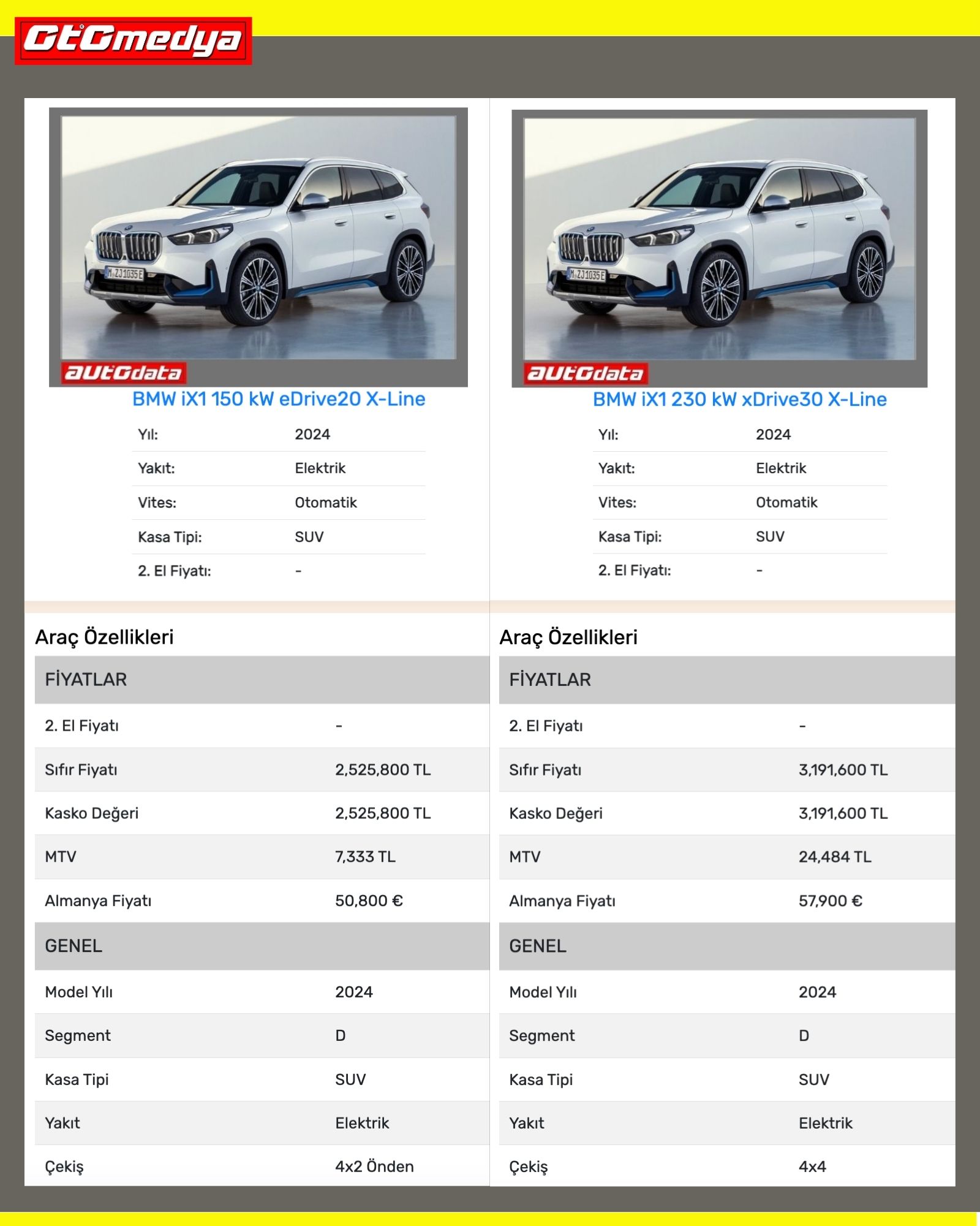 Türkiye’de elektrikli otomobil-lerden alınan ÖTV oranları motor gücü 160 kW’nın altındakiler için % 10-40 arasında değişirken, motor gücü 160 kW üzerindekiler için ise % 60'a kadar çıkıyor. Türkiye’de de satılan BMW iX1 eDrive30 (313 HP-233 kW) modelinin ÖTV dilimi % 60 olduğundan dolayı fiyatı 3.191.600 TL seviyesinde. Ancak bu yeni iX1 eDrive20 modelinin motor gücü 150 kW olduğu için % 40 ÖTV diliminde getirildi.