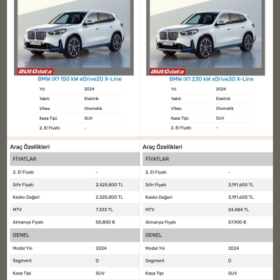 Nasıl mı? Bunu BMW iX1 modeli üzerinden anlatmaya çalışalım. 5 Eylül 2023 tarihli haberimizde yeni BMW iX1 eDrive20 modelinin istenirse 1.600.000 TL’den satılabileceğinin haberini yapmıştık. Hadi bu arada döviz yükseldi diyelim ancak; bu modelin fabrika liste fiyatı 1.450.000 TL seviyesinde tutulsaydı fiyatı 1.914.000 TL olacaktı. Ancak 1.502.000 TL liste fiyatı olduğundan % 40 ÖTV dilimine girdi ve fiyatı 2.525.800 TL oldu.