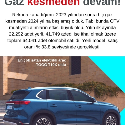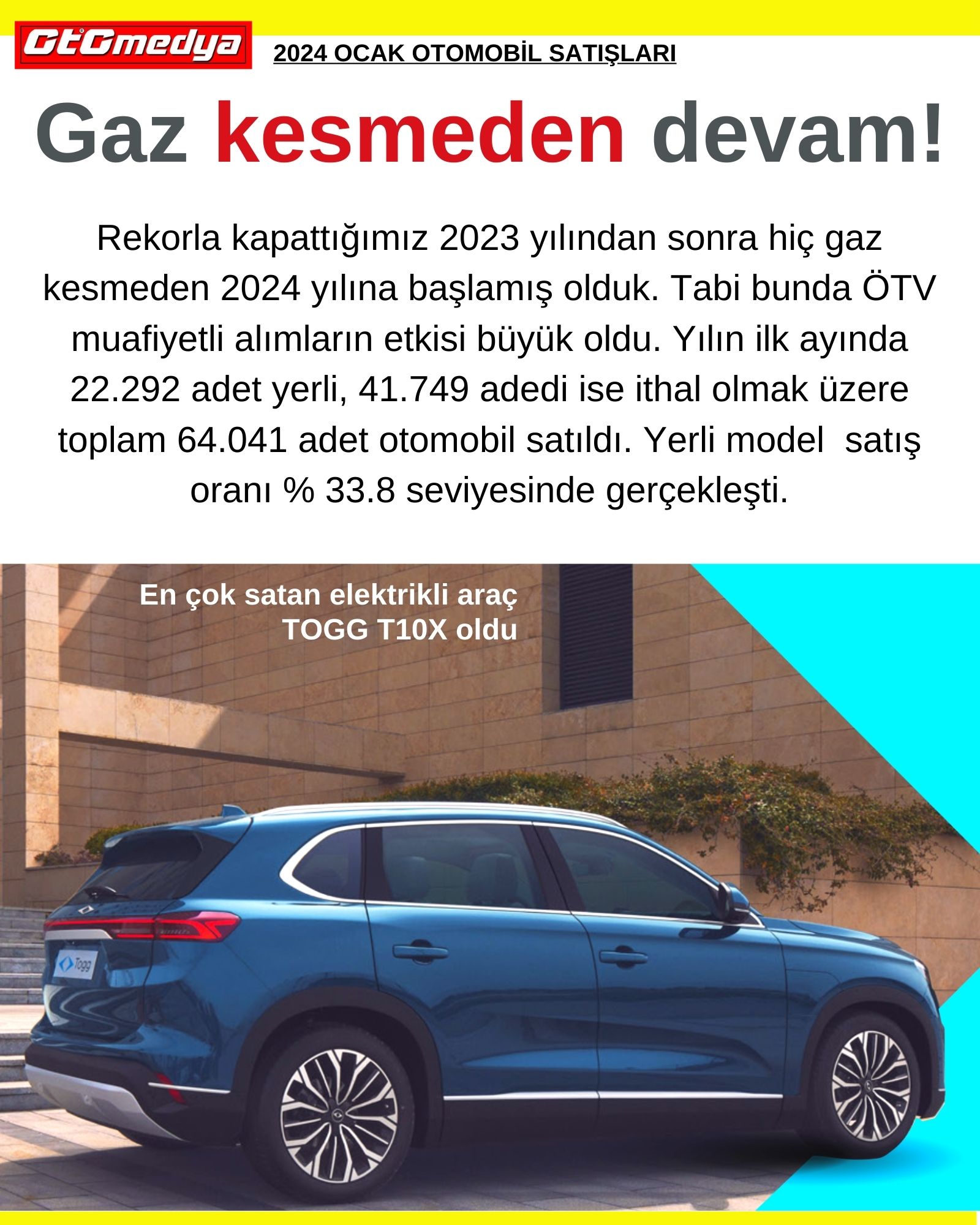 Rekorla kapattığımız 2023 yılından sonra hiç gaz kesmeden 2024 yılına başlamış olduk. Tabi bunda ÖTV muafiyetli alımların etkisi büyük oldu. Yılın ilk ayında 22.292 adet yerli, 41.749 adedi ise ithal olmak üzere toplam 64.041 adet otomobil satıldı. Yerli model satış oranı % 33,8 seviyesinde gerçekleşti.