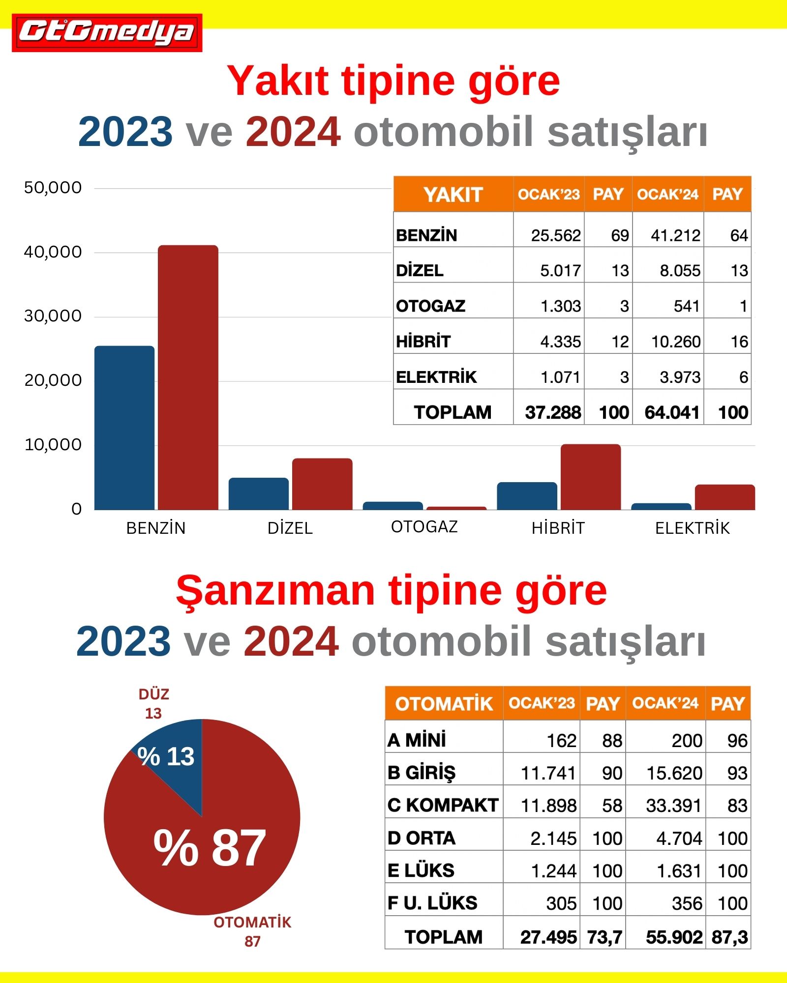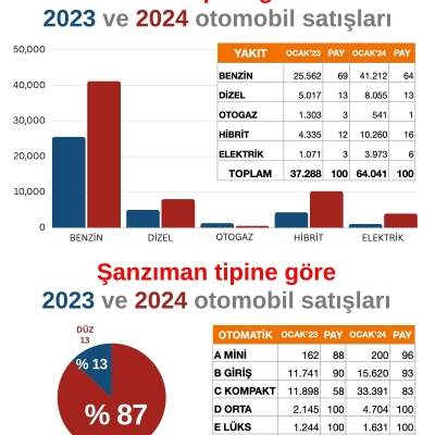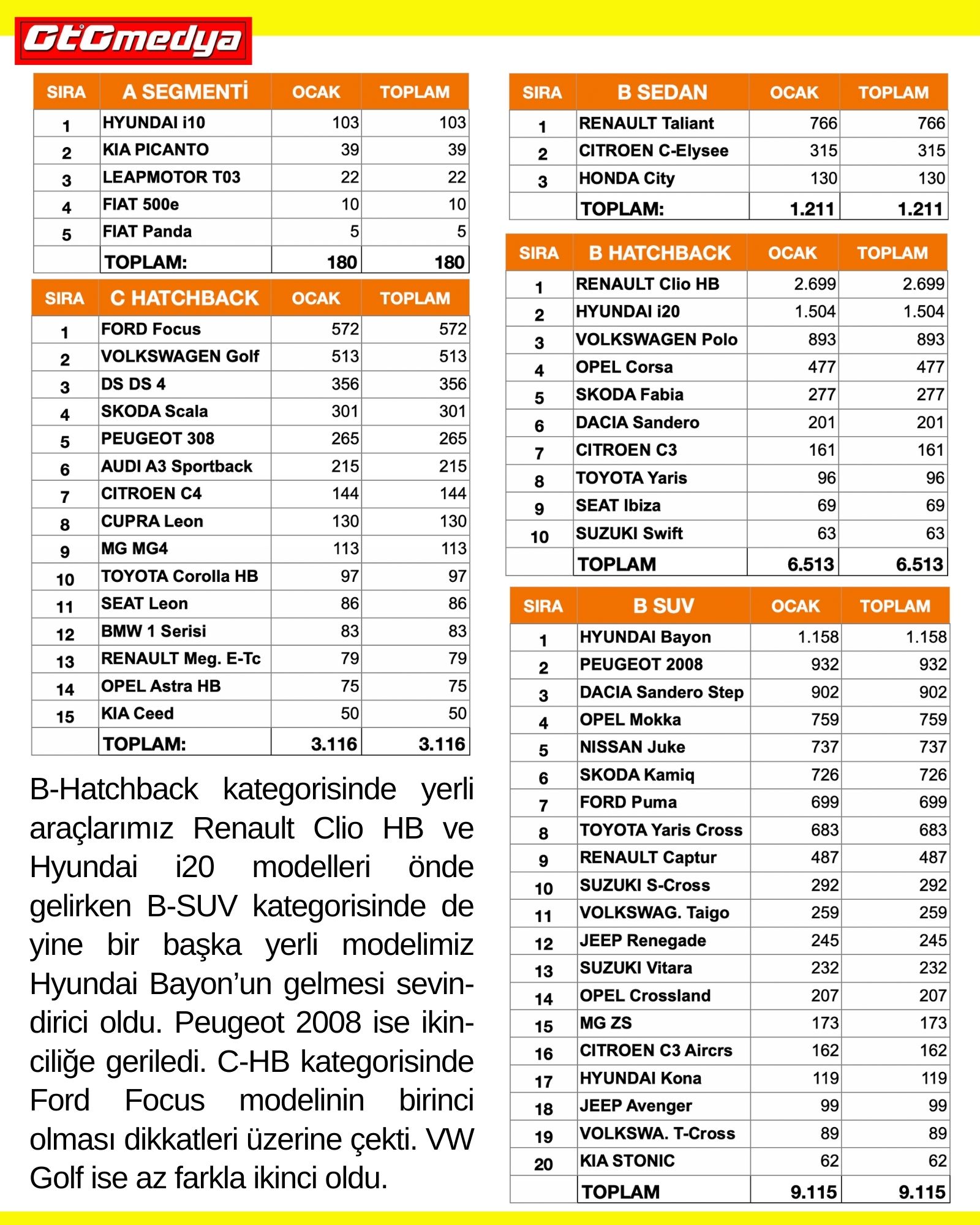 2023 yılında satılan her iki araçtan biri SUV segmentinde yer almıştı. Bu trend Ocak ayında yine SUV lehine devam etti ve her 100 aracın 53'ü SUV segmen-tinde yer aldı. Sedan ülkesi olan ülkemizde bu segmentin satışları bir tık artarak % 30 civarında gerçekleşti. C Hatchback satışları düşmesine karşın B Hatchback satışları yükseliş gösterdi.