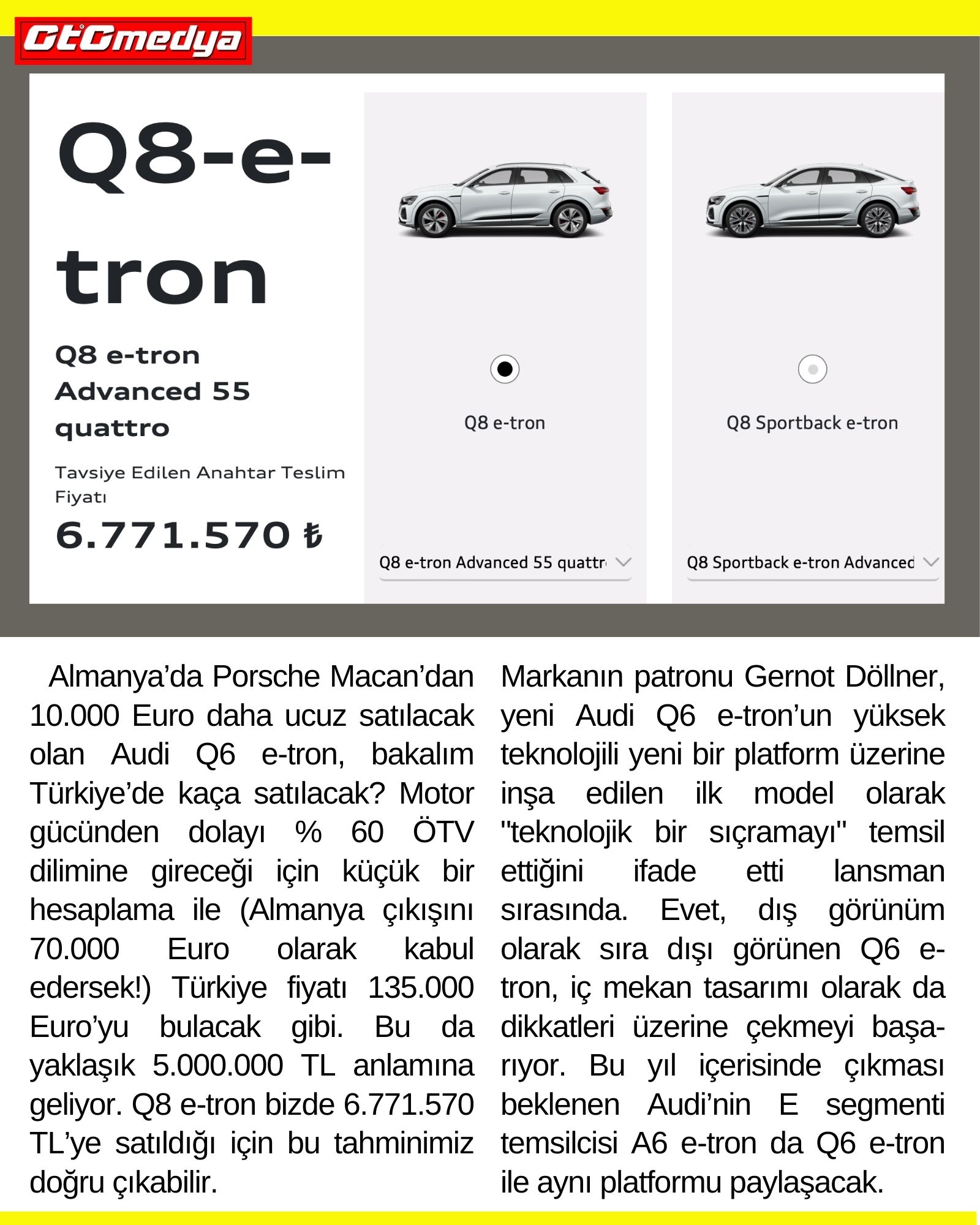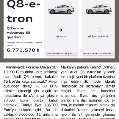 Almanya’da Porsche Macan’dan 10.000 Euro daha ucuz satılacak olan Audi Q6 e-tron, bakalım Türkiye’de kaça satılacak? Motor gücünden dolayı % 60 ÖTV dilimine gireceği için küçük bir hesaplama ile (Almanya çıkışını 70.000 Euro olarak kabul edersek!) Türkiye fiyatı 135.000 Euro’yu bulacak gibi. Bu da yaklaşık 5.000.000 TL anlamına geliyor. Q8 e-tron bizde 6.771.570 TL’ye satıldığı için bu tahminimiz doğru çıkabilir.