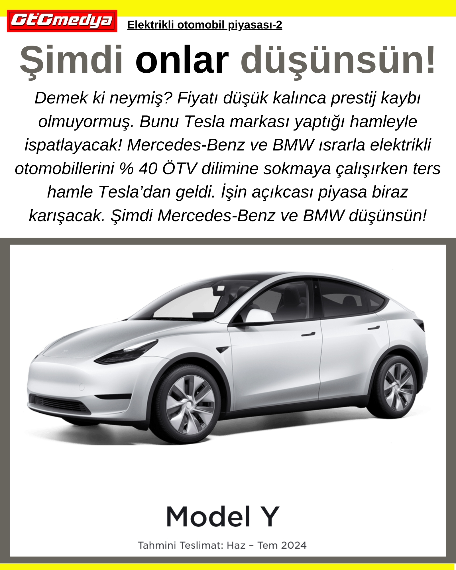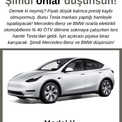 Demek ki neymiş? Fiyatı düşük kalınca prestij kaybı olmuyormuş. Bunu Tesla markası yaptığı hamleyle ispatlayacak! Mercedes-Benz ve BMW ısrarla elektrikli otomobillerini % 40 ÖTV dilimine sokmaya çalışırken ters hamle Tesla’dan geldi. İşin açıkcası piyasa biraz karışacak. Şimdi Mercedes-Benz ve BMW düşünsün!