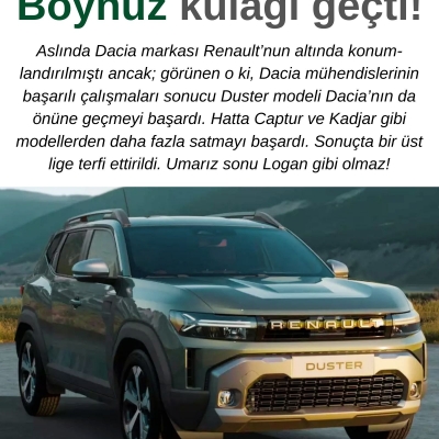 Aslında Dacia markası Renault’nun altında konumlandırılmıştı ancak; görünen o ki, Dacia mühendislerinin başarılı çalışmaları sonucu Duster modeli Dacia’nın da önüne geçmeyi başardı. Hatta Captur ve Kadjar gibi modellerden daha fazla satmayı başardı. Sonuçta bir üst lige terfi ettirildi. Umarız sonu Logan gibi olmaz!