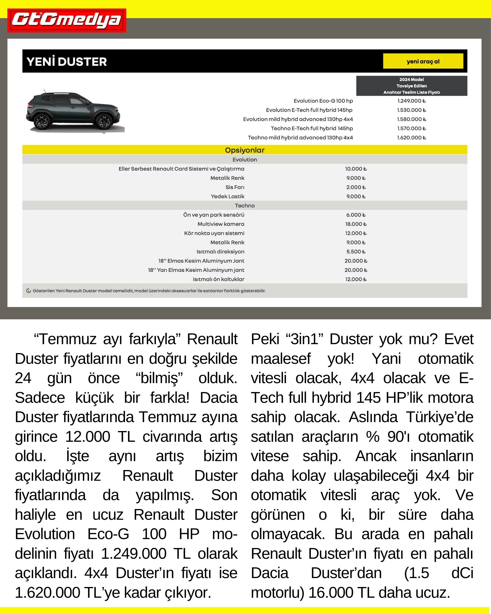 “Temmuz ayı farkıyla” Renault Duster fiyatlarını en doğru şekilde 24 gün önce “bilmiş” olduk. Sadece küçük bir farkla! Dacia Duster fiyatlarında Temmuz ayına girince 12.000 TL civarında artış oldu. İşte aynı artış bizim açıkladığımız Renault Duster fiyatlarında da yapılmış. Son haliyle en ucuz Renault Duster Evolution Eco-G 100 HP mo-delinin fiyatı 1.249.000 TL olarak açıklandı. 4x4 Duster’ın fiyatı ise 1.620.000 TL’ye kadar çıkıyor.
