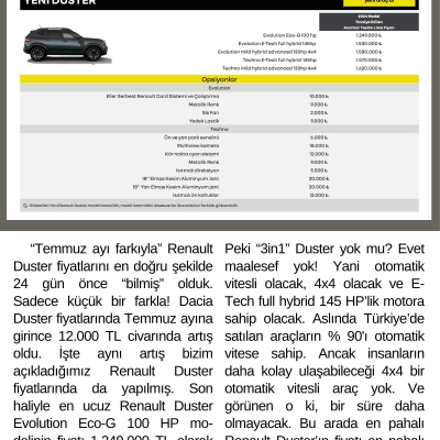 Peki “3in1” Duster yok mu? Evet maalesef yok! Yani otomatik vitesli olacak, 4x4 olacak ve E-Tech full hybrid 145 HP’lik motora sahip olacak. Aslında Türkiye’de satılan araçların % 90'ı otomatik vitese sahip. Ancak insanların daha kolay ulaşabileceği 4x4 bir otomatik vitesli araç yok. Ve görünen o ki, bir süre daha olmayacak. Bu arada en pahalı Renault Duster’ın fiyatı en pahalı Dacia Duster’dan (1.5 dCi motorlu) 16.000 TL daha ucuz.