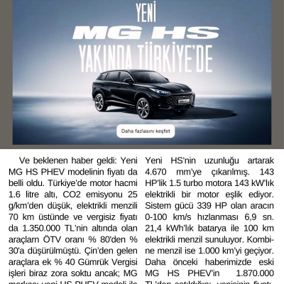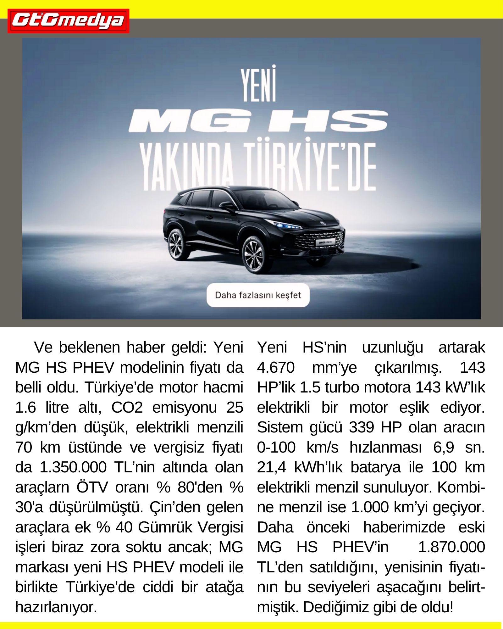 Ve beklenen haber geldi: Yeni MG HS PHEV modelinin fiyatı da belli oldu. Türkiye’de motor hacmi 1.6 litre altı, CO2 emisyonu 25 g/km’den düşük, elektrikli menzili 70 km üstünde ve vergisiz fiyatı da 1.350.000 TL’nin altında olan araçlarn ÖTV oranı % 80'den % 30'a düşürülmüştü. Çin’den gelen araçlara ek % 40 Gümrük Vergisi işleri biraz zora soktu ancak; MG markası yeni HS PHEV modeli ile birlikte Türkiye’de ciddi bir atağa hazırlanıyor.