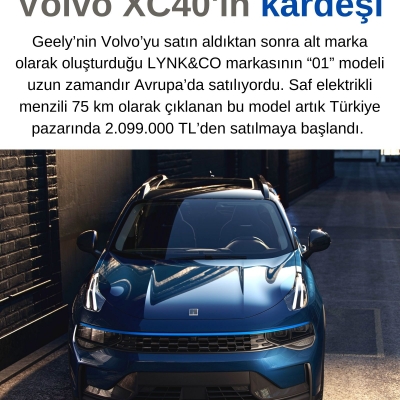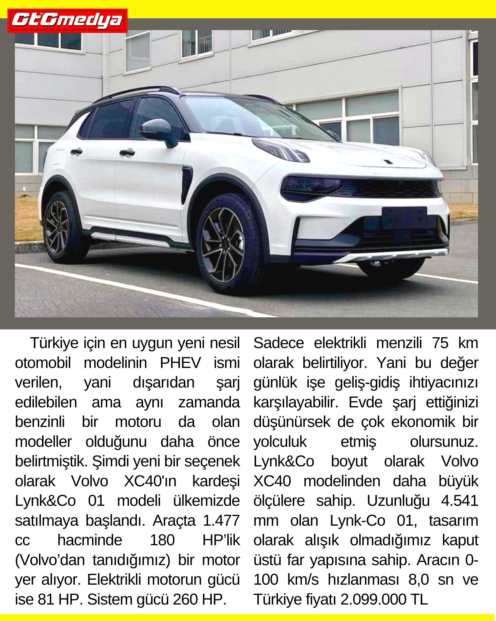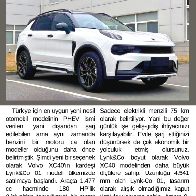 Türkiye için en uygun yeni nesil otomobil modelinin PHEV ismi verilen, yani dışarıdan şarj edilebilen ama aynı zamanda benzinli bir motoru da olan modeller olduğunu daha önce belirtmiştik. Şimdi yeni bir seçenek olarak Volvo XC40'ın kardeşi Lynk&Co 01 modeli ülkemizde satılmaya başlandı. Araçta 1.477 cc hacminde 180 HP’lik (Volvo’dan tanıdığımız) bir motor yer alıyor. Elektrikli motorun gücü ise 81 HP. Sistem gücü 260 HP.