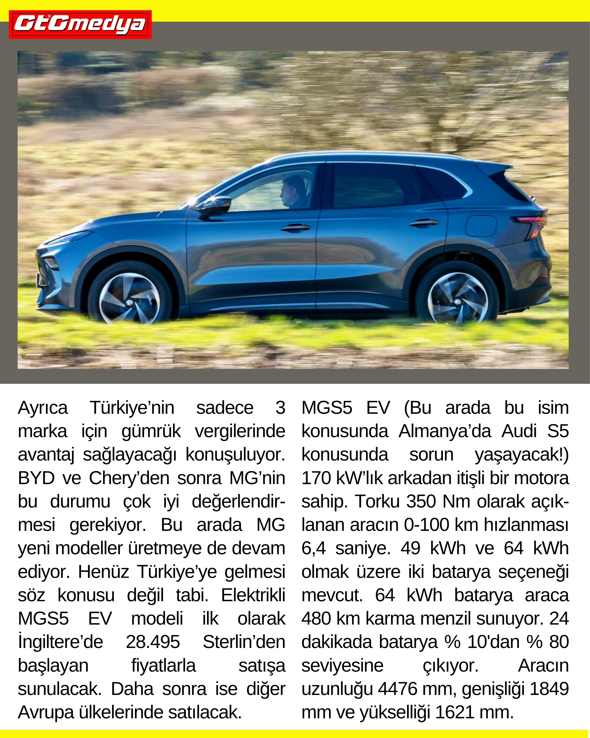 Ayrıca Türkiye’nin sadece 3 marka için gümrük vergilerinde avantaj sağlayacağı konuşuluyor. BYD ve Chery’den sonra MG’nin bu durumu çok iyi değerlendirmesi gerekiyor. Bu arada MG yeni modeller üretmeye de devam ediyor. Henüz Türkiye’ye gelmesi söz konusu değil tabi. Elektrikli MGS5 EV modeli ilk olarak İngiltere’de 28.495 Sterlin’den başlayan fiyatlarla satışa sunulacak. Daha sonra ise diğer Avrupa ülkelerinde satılacak.