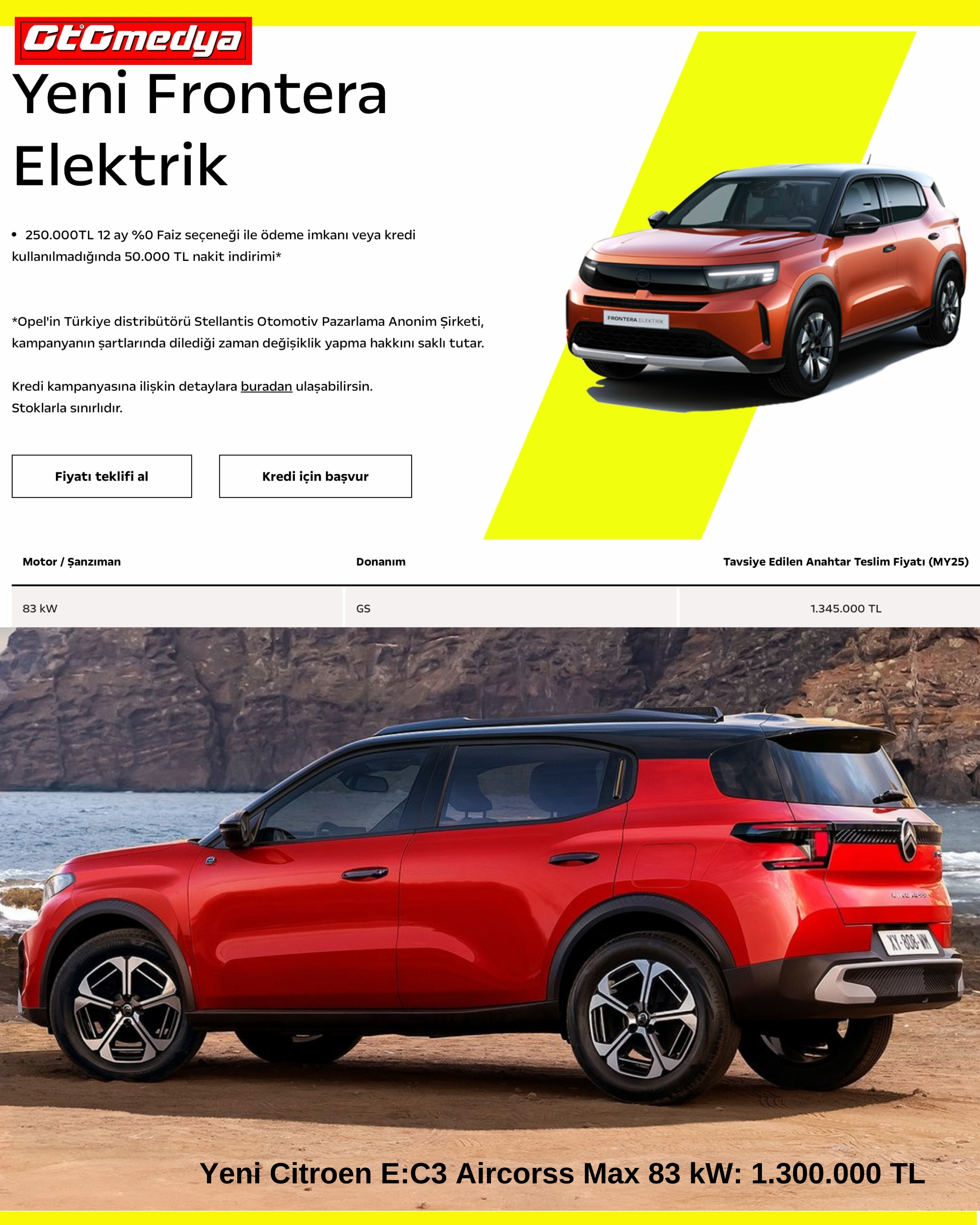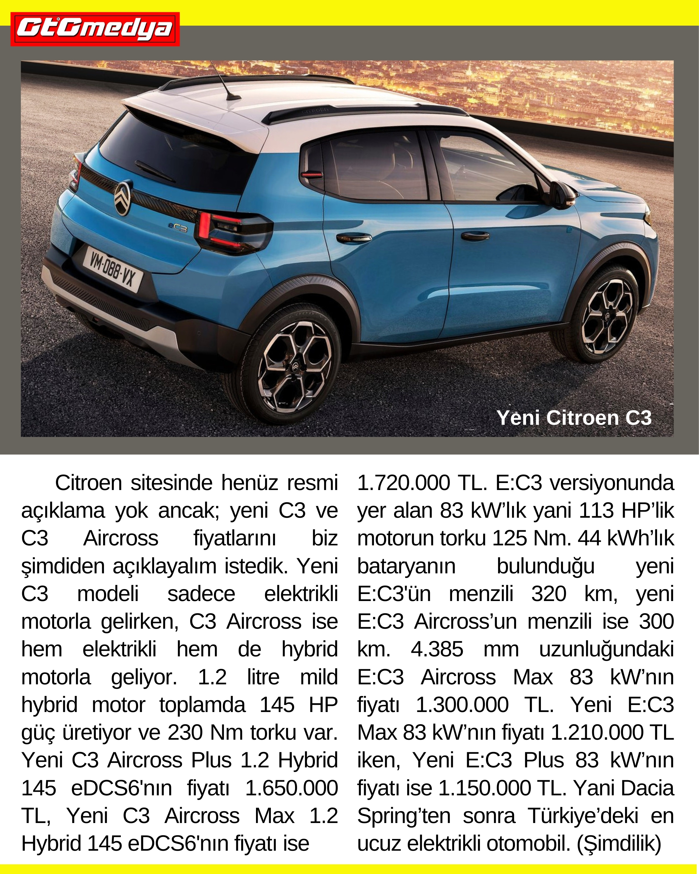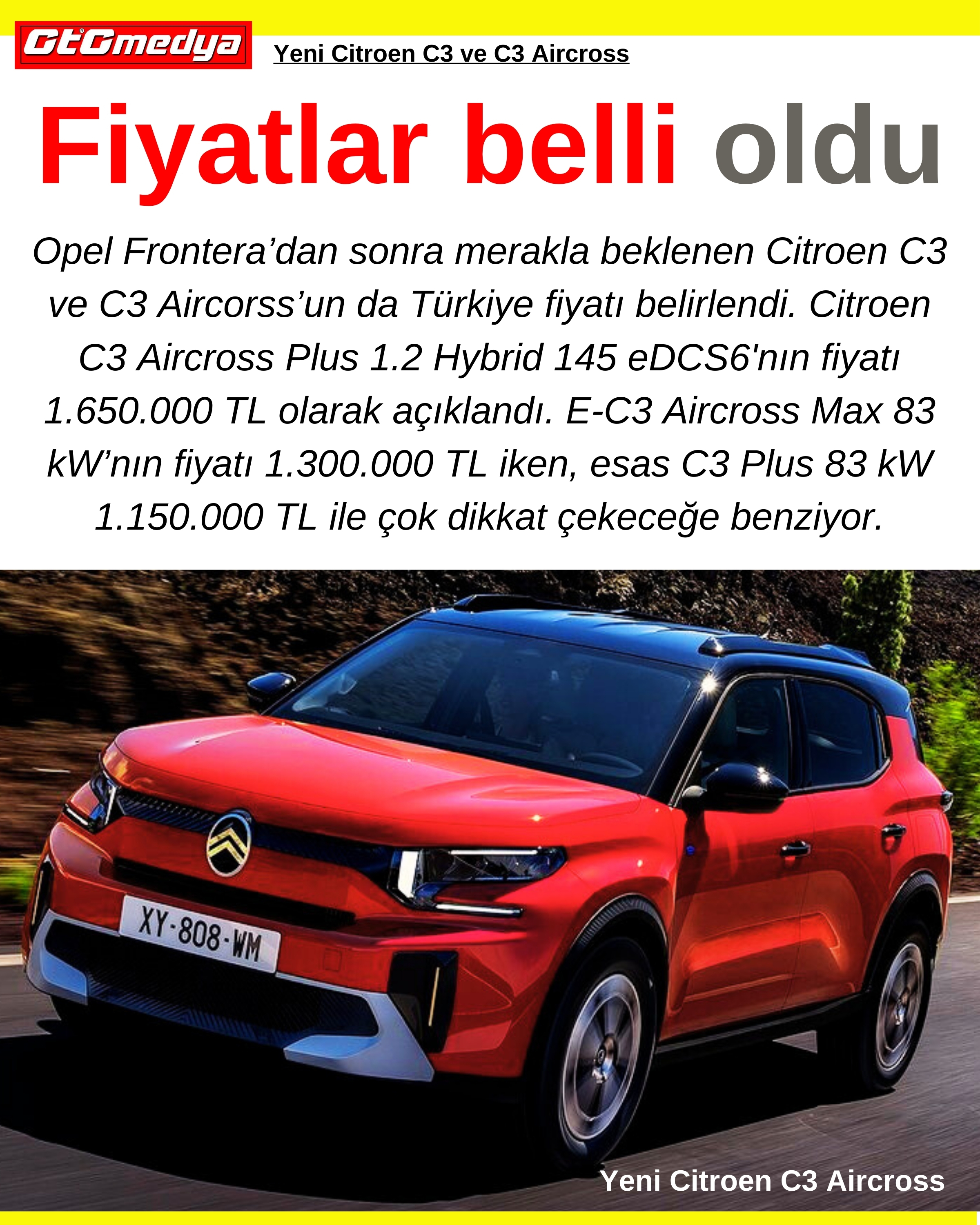 Opel Frontera’dan sonra merakla beklenen Citroen C3 ve C3 Aircorss’un da Türkiye fiyatı belirlendi. Citroen C3 Aircross Plus 1.2 Hybrid 145 eDCS6'nın fiyatı 1.650.000 TL olarak açıklandı. E-C3 Aircross Max 83 kW’nın fiyatı 1.300.000 TL iken, esas C3 Plus 83 kW 1.150.000 TL ile çok dikkat çekeceğe benziyor.