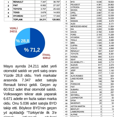 Mayıs ayında 24.211 adet yerli otomobil satıldı ve yerli satış oranı Yüzde 28,8 oldu. Yerli markalar arasında 7.347 adet satışla Renault birinci oldu. Geçen ay 60.912 adet ithal otomobil satıldı. Volkswagen tekrar atak yaparak 6.671 adetle en fazla satan marka oldu. Onu 5.036 adet satışla BYD takip etti. Böylece BYD’nin geçen yıl açıkladığı “Türkiye’de ilk3’e girmek istiyoruz” söylemi gerçekleşmiş oldu.