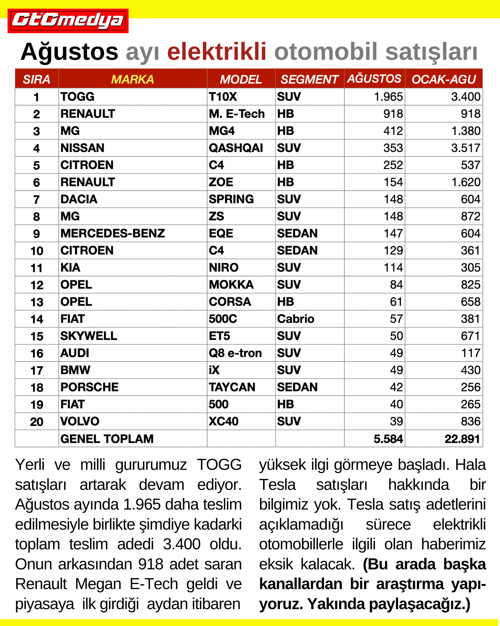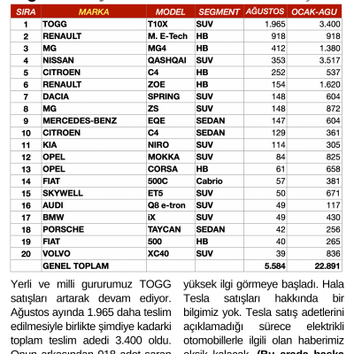 Yerli ve milli gururumuz TOGG satışları artarak devam ediyor. Ağustos ayında 1.965 daha teslim edilmesiyle birlikte şimdiye kadarki toplam teslim adedi 3.400 oldu. Onun arkasından 918 adet saran Renault Megan E-Tech geldi ve piyasaya  ilk girdiği  aydan itibaren yüksek ilgi görmeye başladı. Hala Tesla satışları hakkında bir bilgimiz yok. Tesla satış adetlerini açıklamadığı sürece elektrikli otomobillerle ilgili olan haberimiz eksik kalacak. (Bu arada başka kanallardan bir araştırma yapı-yoruz. Yakında paylaşacağız.)