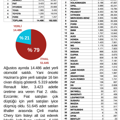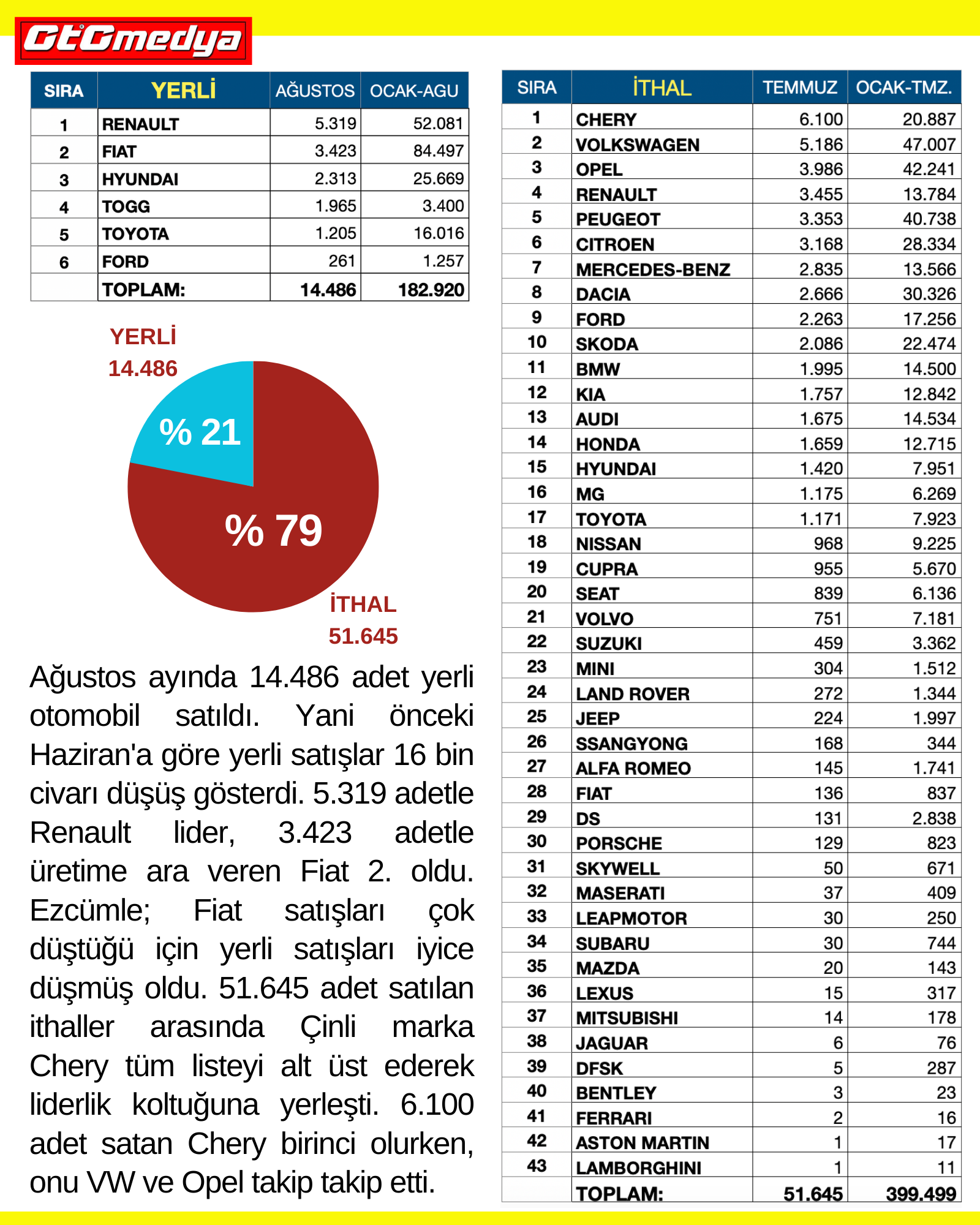 Evet yanlış okumadınız! Sıfır otomobil bulunurluğu artarken satışlar düşüyor. Çünkü otomobil yakın zamandaki gibi yatırım aracı olmaktan uzaklaşıyor. Ağustos ayında 14.486 adet yerli otomobil satıldı. Yani önceki Haziran'a göre yerli satışlar 16 bin civarı düşüş gösterdi. 5.319 adetle Renault lider, 3.423 adetle üretime ara veren Fiat 2. oldu. Ezcümle; Fiat satışları çok düştüğü için yerli satışları iyice düşmüş oldu. 51.645 adet satılan ithaller arasında Çinli marka Chery tüm listeyi alt üst ederek  liderlik koltuğuna yerleşti. 6.100 adet satan Chery birinci olurken, onu VW ve Opel takip takip etti.