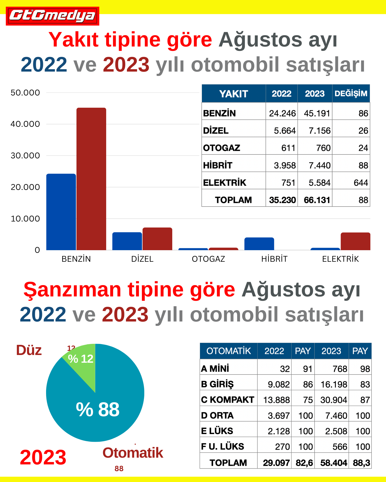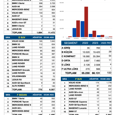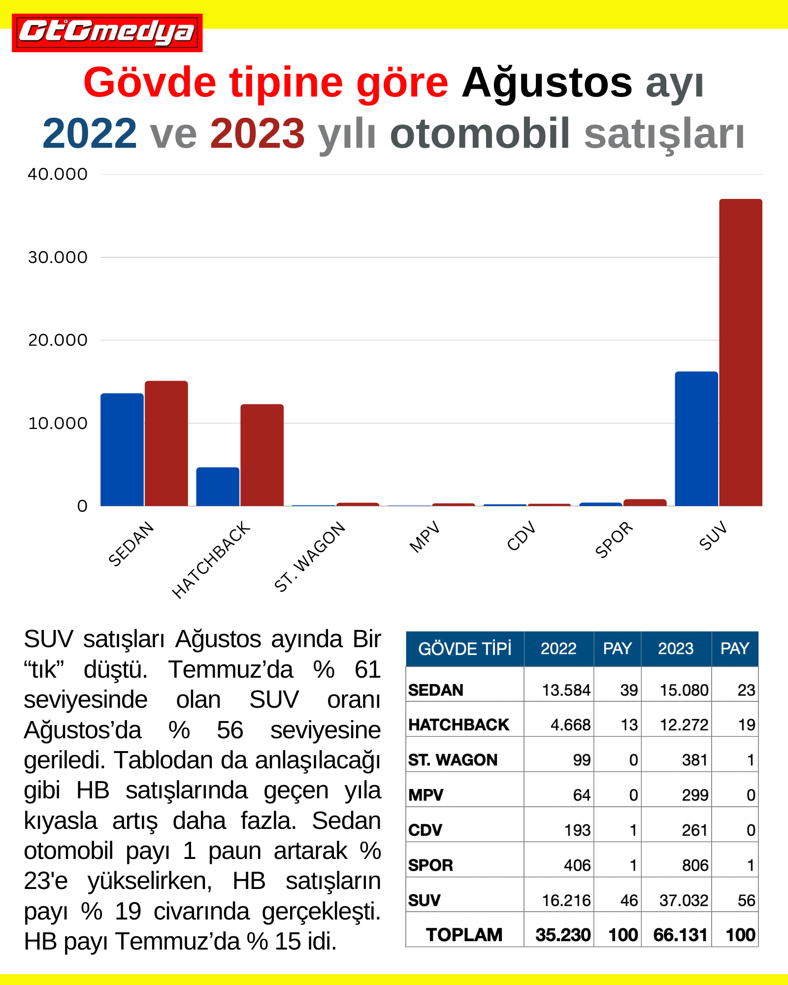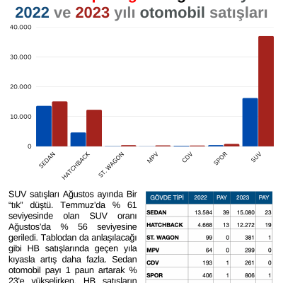 SUV satışları Ağustos ayında Bir “tık” düştü. Temmuz’da % 61 seviyesinde olan SUV oranı Ağustos’da % 56 seviyesine geriledi. Tablodan da anlaşılacağı gibi HB satışlarında geçen yıla  kıyasla artış daha fazla. Sedan otomobil payı 1 paun artarak % 23'e yükselirken, HB satışların payı % 19 civarında gerçekleşti. HB payı Temmuz’da % 15 idi.