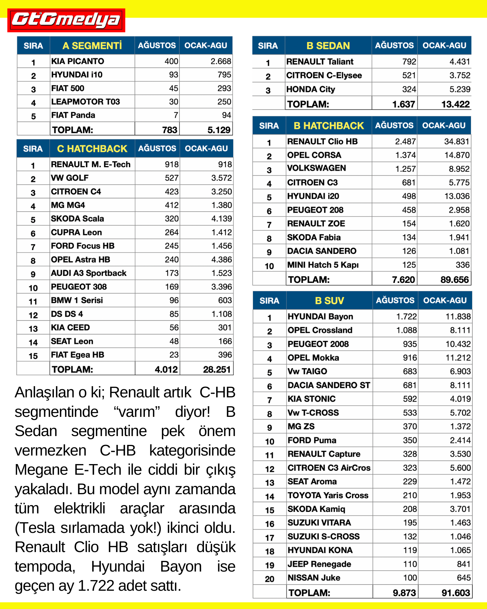 Anlaşılan o ki; Renault artık  C-HB segmentinde “varım” diyor! B Sedan segmentine pek önem vermezken C-HB kategorisinde Megane E-Tech ile ciddi bir çıkış yakaladı. Bu model aynı zamanda tüm elektrikli araçlar arasında (Tesla sırlamada yok!) ikinci oldu. Renault Clio HB satışları düşük tempoda, Hyundai Bayon ise geçen ay 1.722 adet sattı.