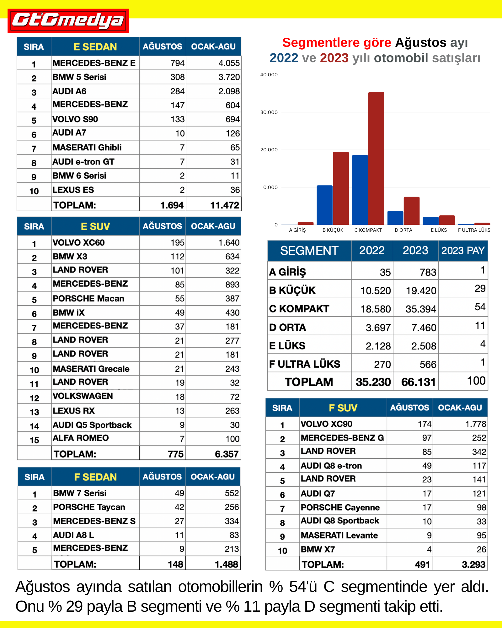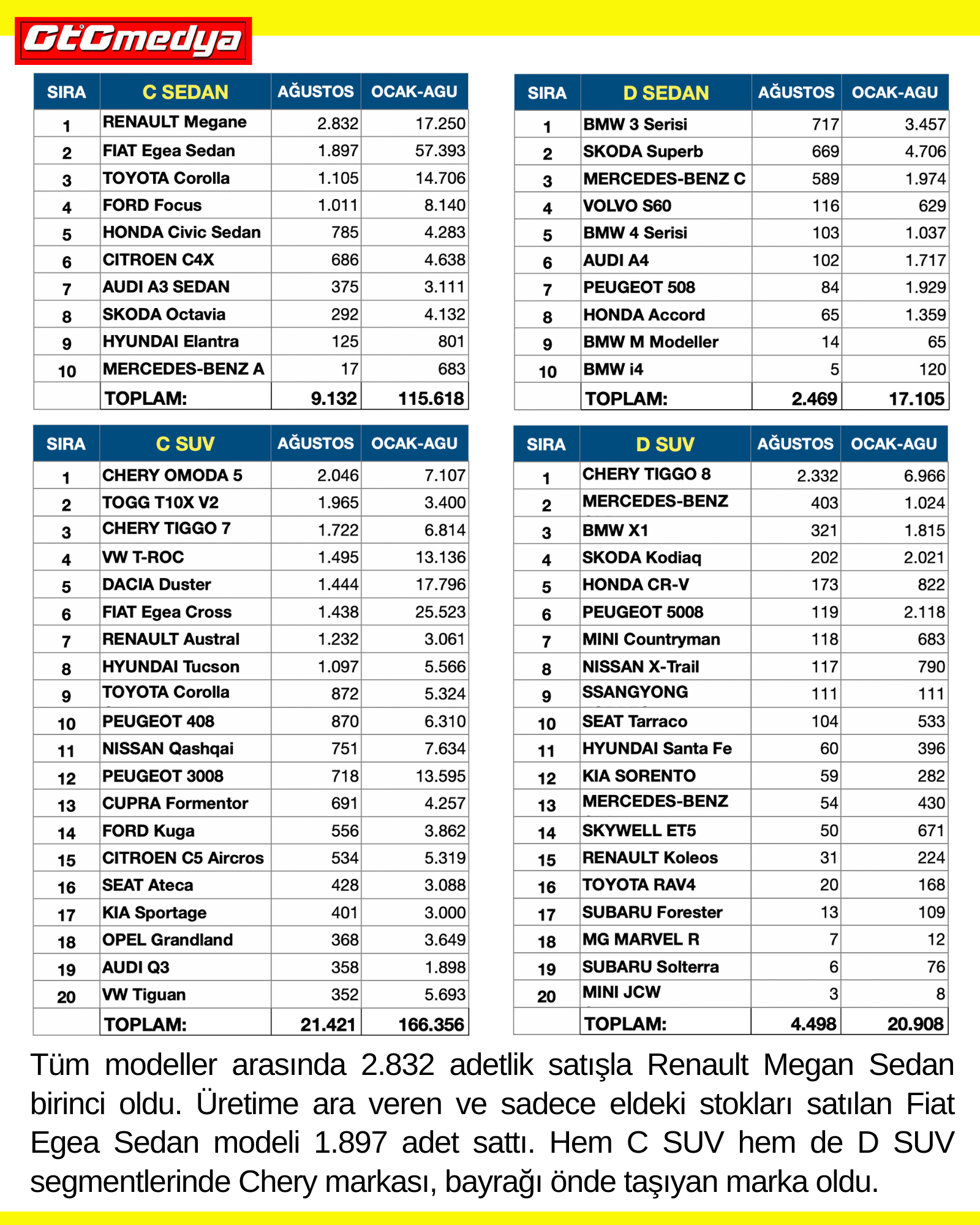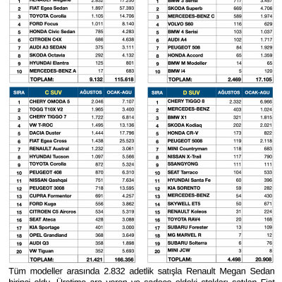 Tüm modeller arasında 2.832 adetlik satışla Renault Megan Sedan birinci oldu. Üretime ara veren ve sadece eldeki stokları satılan Fiat Egea Sedan modeli 1.897 adet sattı. Hem C SUV hem de D SUV segmentlerinde Chery markası, bayrağı önde taşıyan marka oldu.