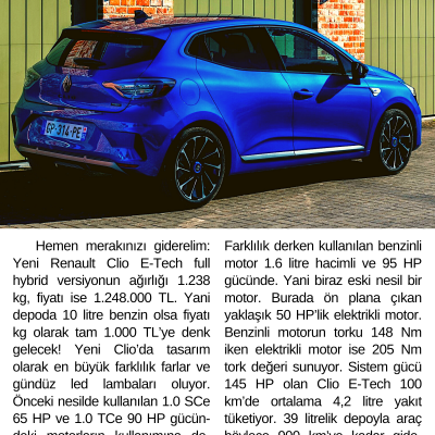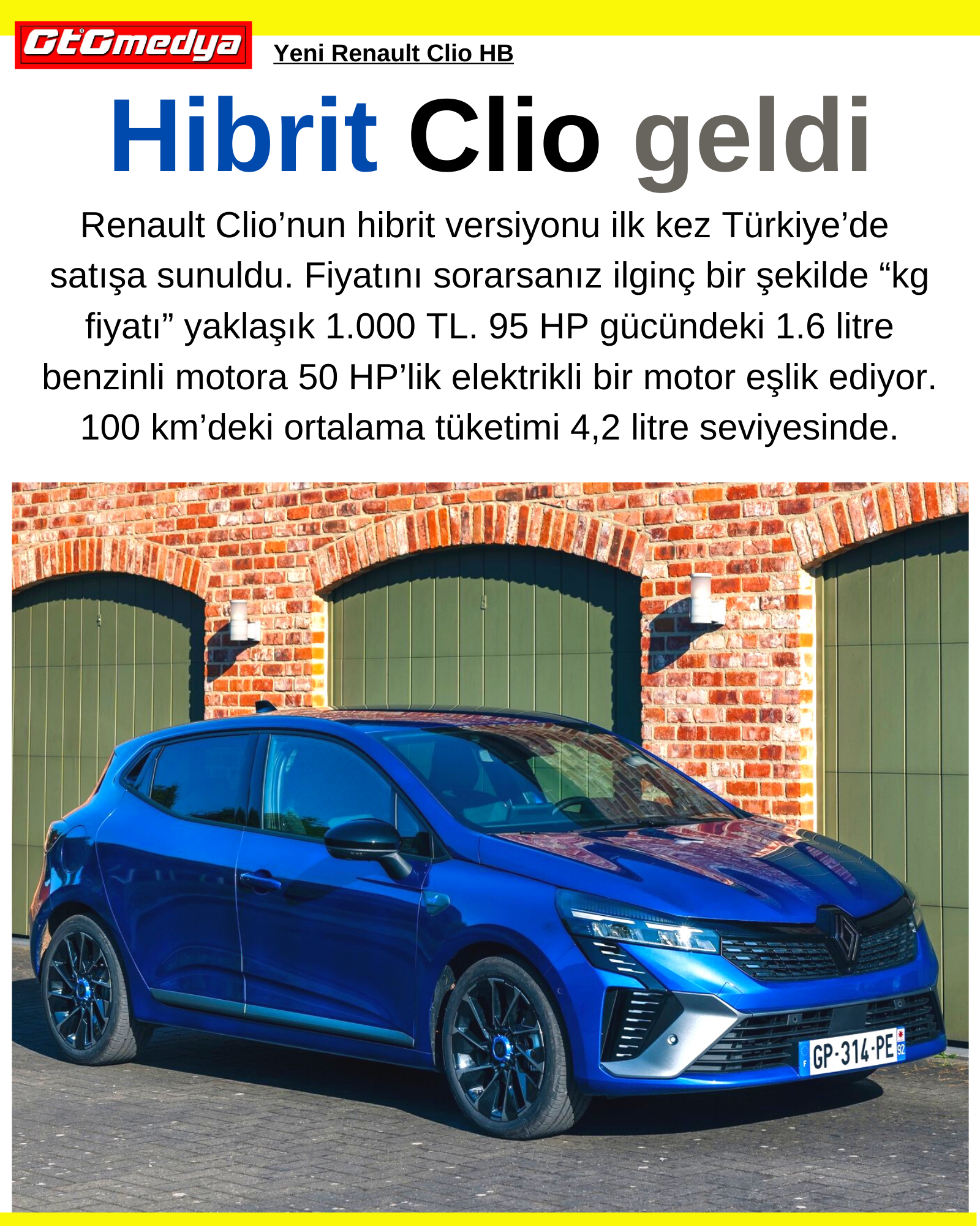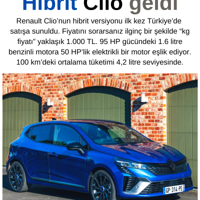 Renault Clio’nun hibrit versiyonu ilk kez Türkiye’de satışa sunuldu. Fiyatını sorarsanız ilginç bir şekilde “kg fiyatı” yaklaşık 1.000 TL. 95 HP gücündeki 1.6 litre benzinli motora 50 HP’lik elektrikli bir motor eşlik ediyor. 100 km’deki ortalama tüketimi 4,2 litre.