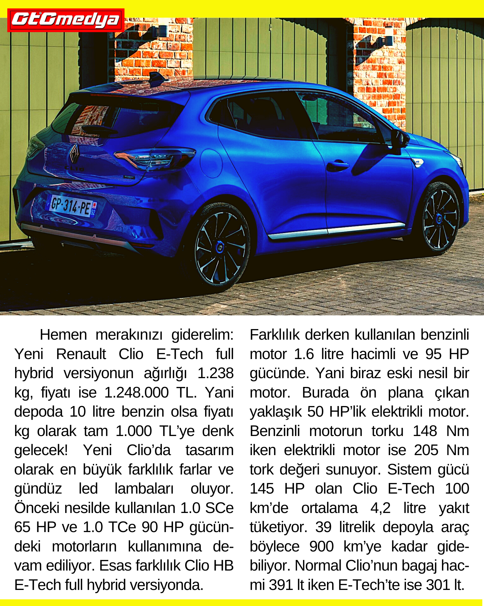 Hemen merakınızı giderelim: Yeni Renault Clio E-Tech full hybrid versiyonun ağırlığı 1.238 kg, fiyatı ise 1.248.000 TL. Yani depoda 10 litre benzin olsa fiyatı kg olarak tam 1.000 TL’ye denk gelecek! Yeni Clio’da tasarım olarak en büyük farklılık farlar ve gündüz led lambaları oluyor. Önceki nesilde kullanılan 1.0 SCe 65 HP ve 1.0 TCe 90 HP gücün-deki motorların kullanımına devam ediliyor. Esas farklılık Clio HB E-Tech full hybrid versiyonda.
