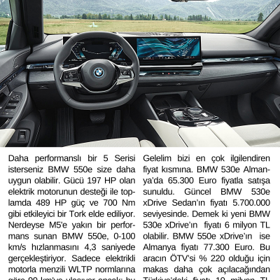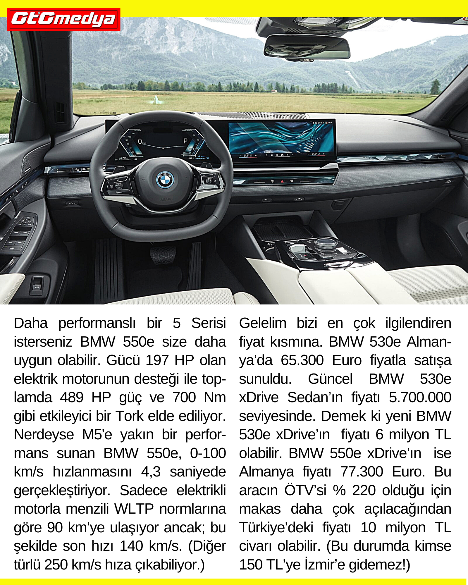 Gelelim bizi en çok ilgilendiren fiyat kısmına. BMW 530e Alman-ya’da 65.300 Euro fiyatla satışa sunuldu. Güncel BMW 530e xDrive Sedan’ın fiyatı 5.700.000 seviyesinde. Demek ki yeni BMW 530e xDrive’ın fiyatı 6 milyon TL olabilir. BMW 550e xDrive’ın ise Almanya fiyatı 77.300 Euro. Bu aracın ÖTV’si % 220 olduğu için makas daha çok açılacağından Türkiye’deki fiyatı 10 milyon TL civarı olabilir. (Bu durumda kimse 150 TL’ye İzmir’e gidemez!)