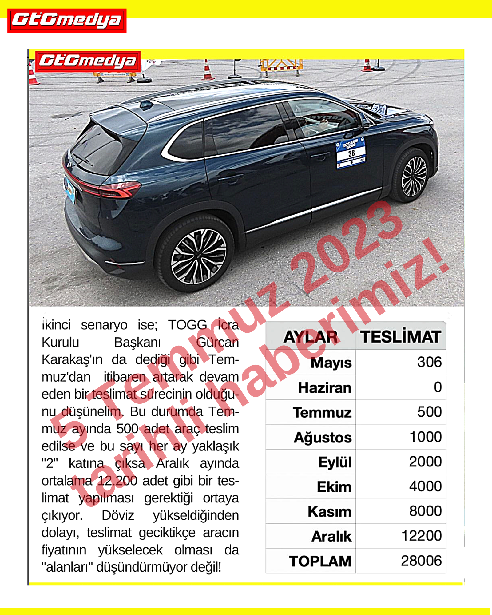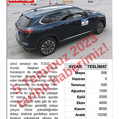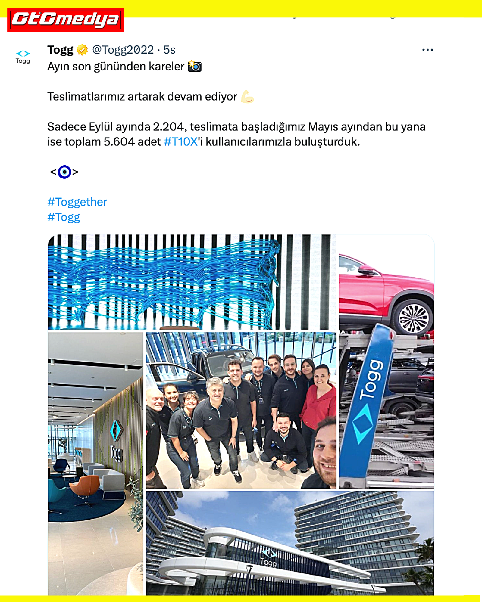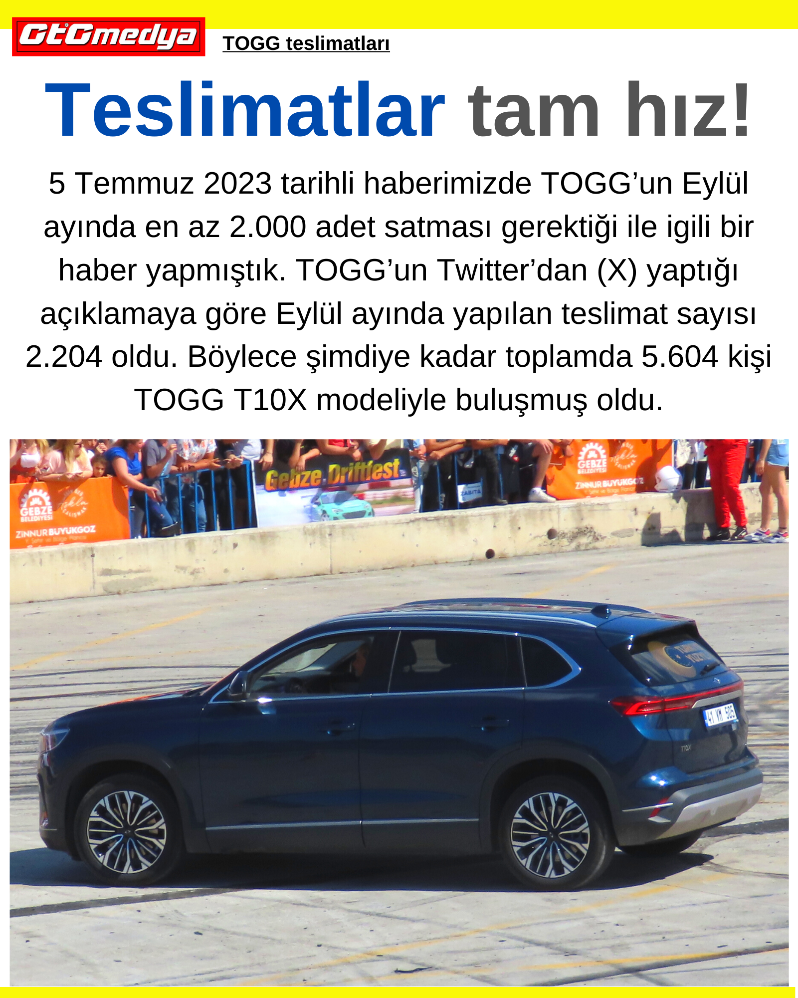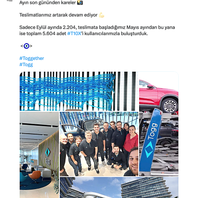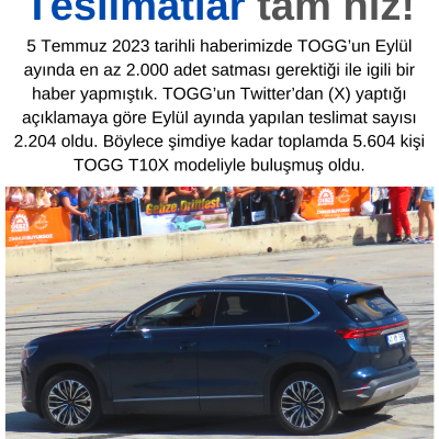 5 Temmuz 2023 tarihli haberimizde TOGG’un Eylül ayında en az 2.000 adet satması gerektiği ile igili bir haber yapmıştık. TOGG’un Twitter’dan (X) yaptığı açıklamaya göre Eylül ayında yapılan teslimat sayısı 2.204 oldu. Böylece şimdiye kadar toplamda 5.604 kişi TOGG T10X modeliyle buluşmuş oldu.