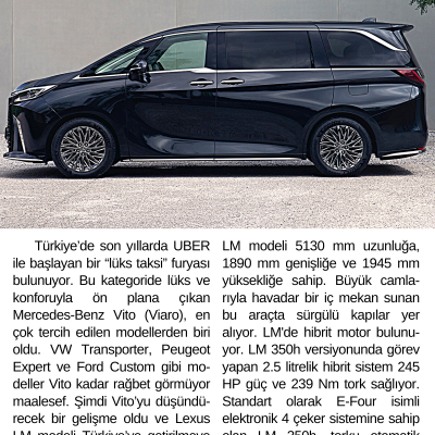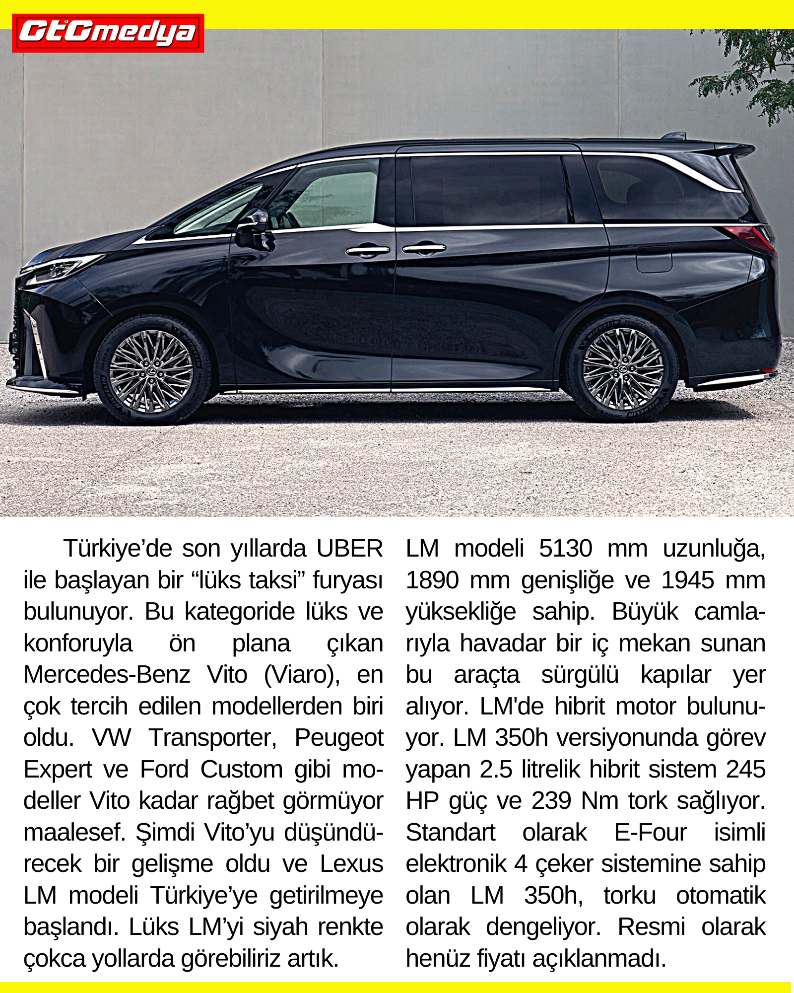 Türkiye’de son yıllarda UBER ile başlayan bir “lüks taksi” furyasıdır gidiyor. Bu kategoride lüks ve konforuyla ön plana çıkan Mercedes-Benz Vito (V-Class), en çok tercih edilen modellerden biri oldu. VW Transporter, Peugeot Expert ve Ford Custom gibi modeller Vito kadar rağbet görmüyor maalesef. Şimdi Vito’yu düşündürecek bir gelişme gerçekleşti ve Lexus LM modeli Türkiye’ye getirilmeye başlandı. Lüks LM’yi siyah renkte çokca yollarda görebiliriz artık.