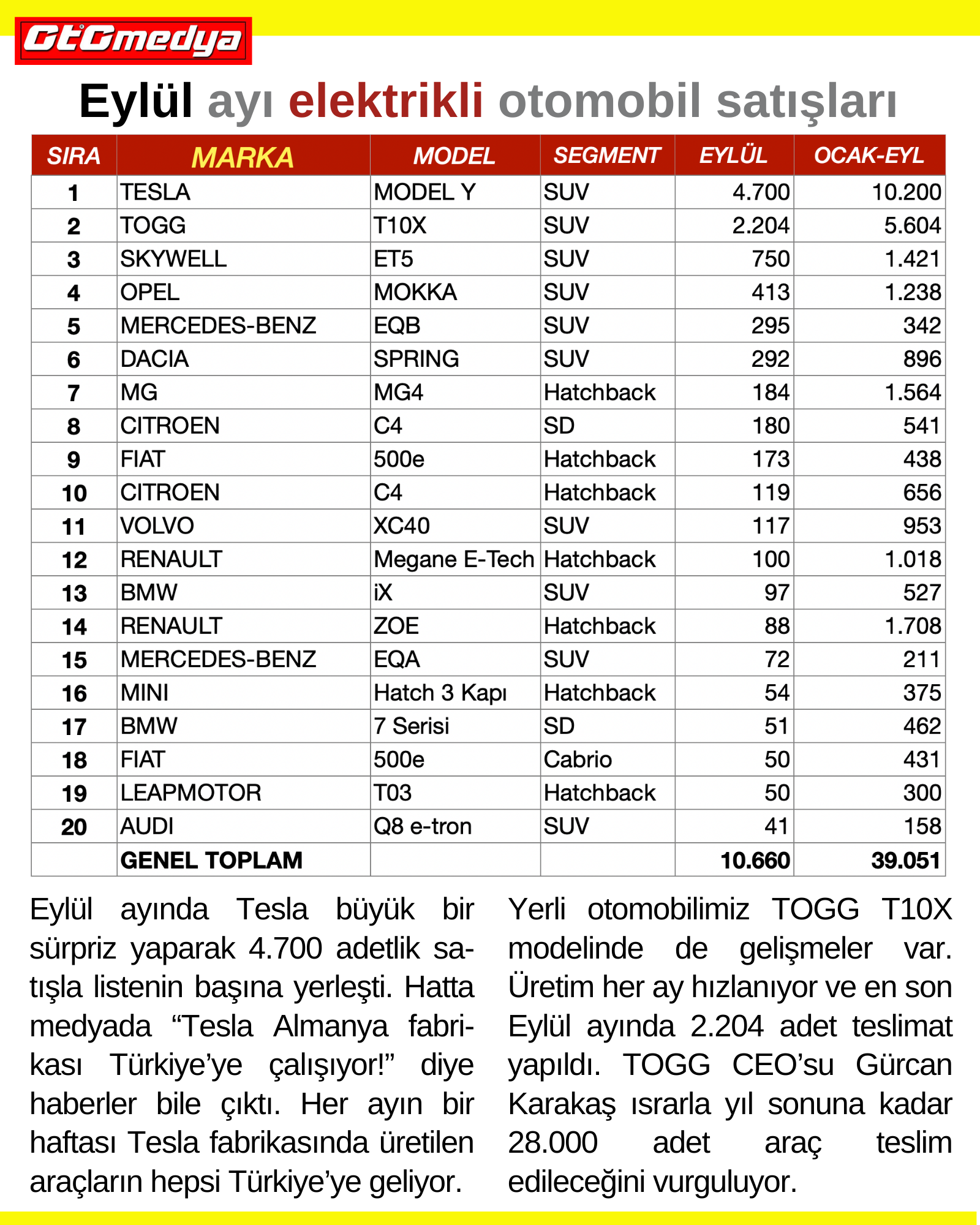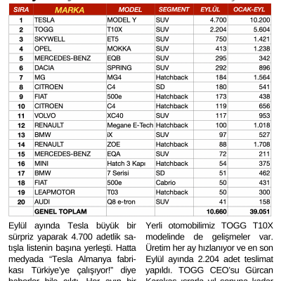 Eylül ayında Tesla büyük bir sürpriz yaparak 4.700 adetlik satışla listenin başına yerleşti. Hatta medyada “Tesla Almanya fabrikası Türkiye’ye çalışıyor!” diye haberler bile çıktı. Her ayın bir haftası Tesla fabrikasında üretilen araçların hepsi Türkiye’ye geliyor. Yerli otomobilimiz TOGG T10X modelinde de gelişmeler var. Üretim her ay hızlanıyor ve en son Eylül ayında 2.204 adet teslimat yapıldı. TOGG CEO’su Gürcan Karakaş ısrarla yıl sonuna kadar 28.000 adet araç teslim edileceğini vurguluyor.