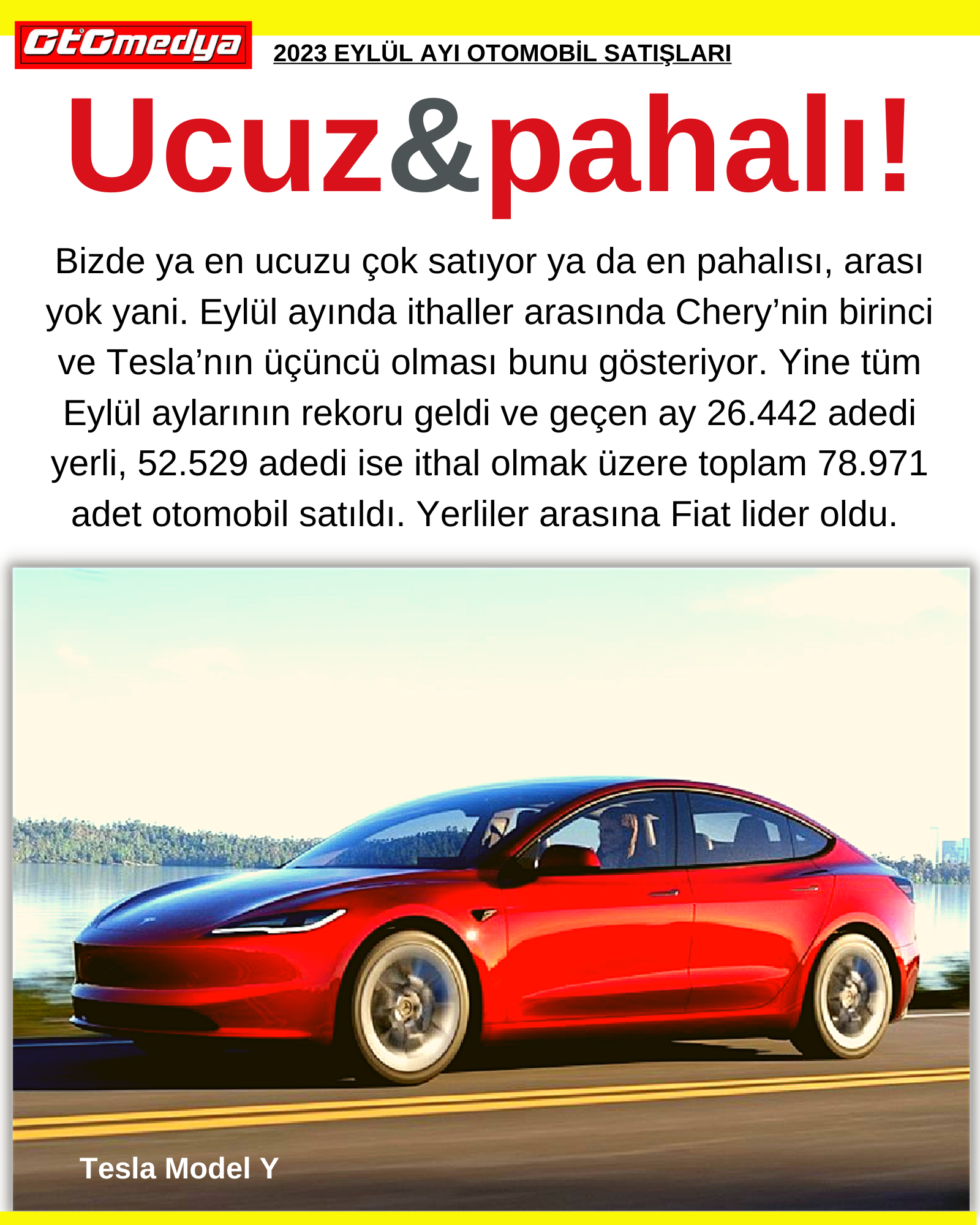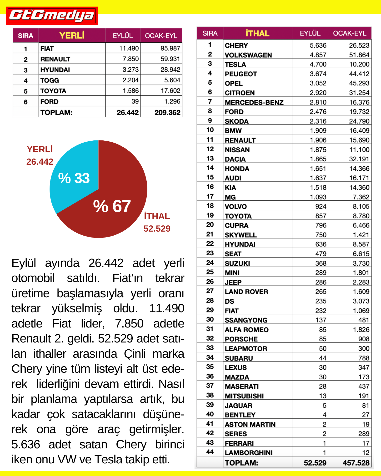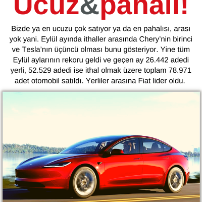 Eylül ayında 26.442 adet yerli otomobil satıldı. Fiat’ın tekrar üretime başlamasıyla yerli oranı tekrar yükselmiş oldu. 11.490 adetle Fiat lider, 7.850 adetle Renault 2. geldi. 52.529 adet satılan ithaller arasında Çinli marka Chery yine tüm listeyi alt üst ederek liderliğini devam ettirdi. Nasıl bir planlama yaptılarsa artık, bu kadar çok satacaklarını düşünerek ona göre araç getirmişler. 5.636 adet satan Chery birinci iken onu VW ve Tesla takip etti.