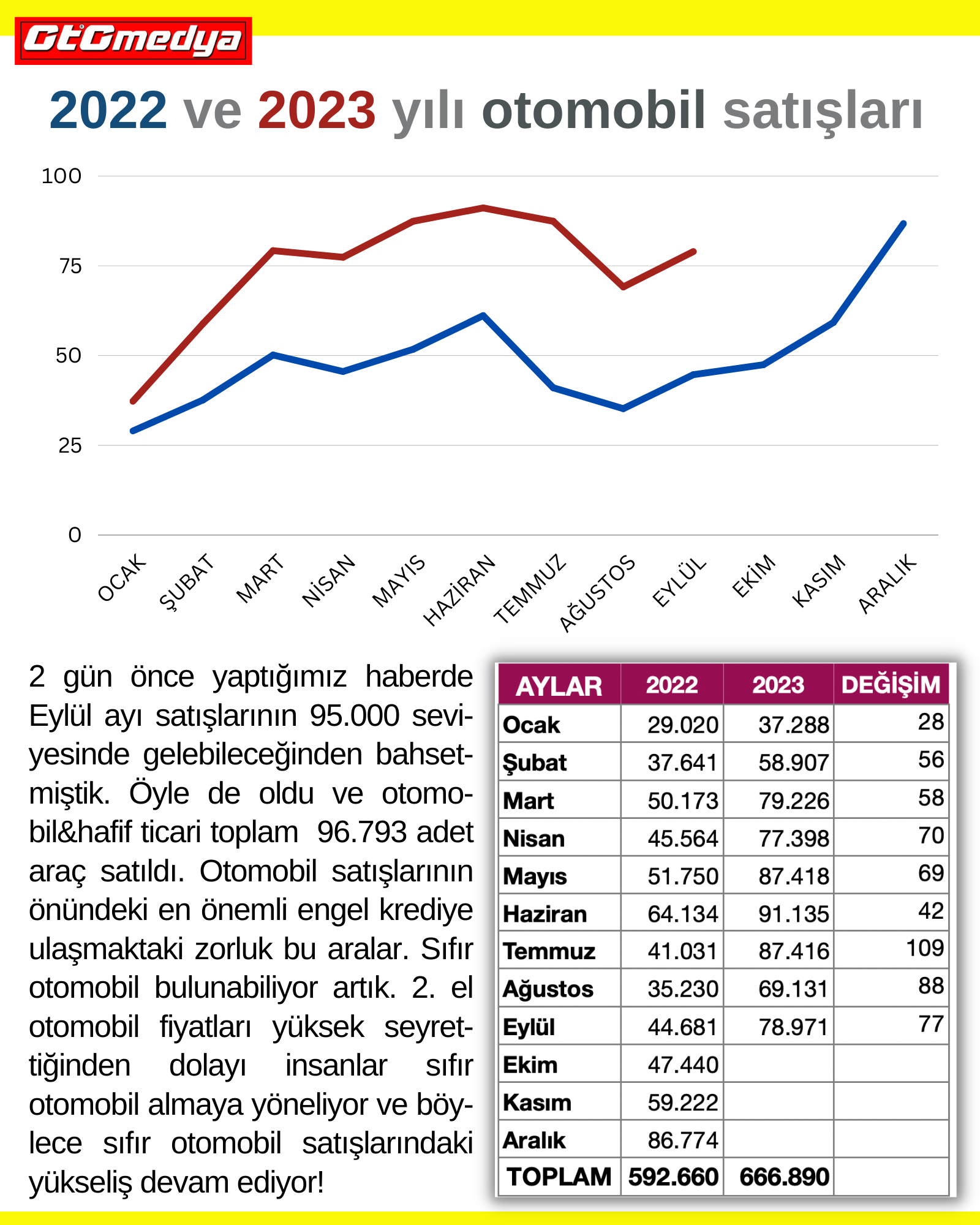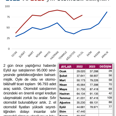 2 gün önce yaptığımız haberde Eylül ayı satışlarının 95.000 seviyesinde gelebileceğinden bahsetmiştik. Öyle de oldu ve otomobil&hafif ticari toplam 96.793 adet araç satıldı. Otomobil satışlarının önündeki en önemli engel krediye ulaşmaktaki zorluk bu aralar. Sıfır otomobil bulunabiliyor artık. 2. el otomobil fiyatları yüksek seyrettiğinden dolayı insanlar sıfır otomobil almaya yöneliyor ve böylece sıfır otomobil satışlarındaki yükseliş devam ediyor!