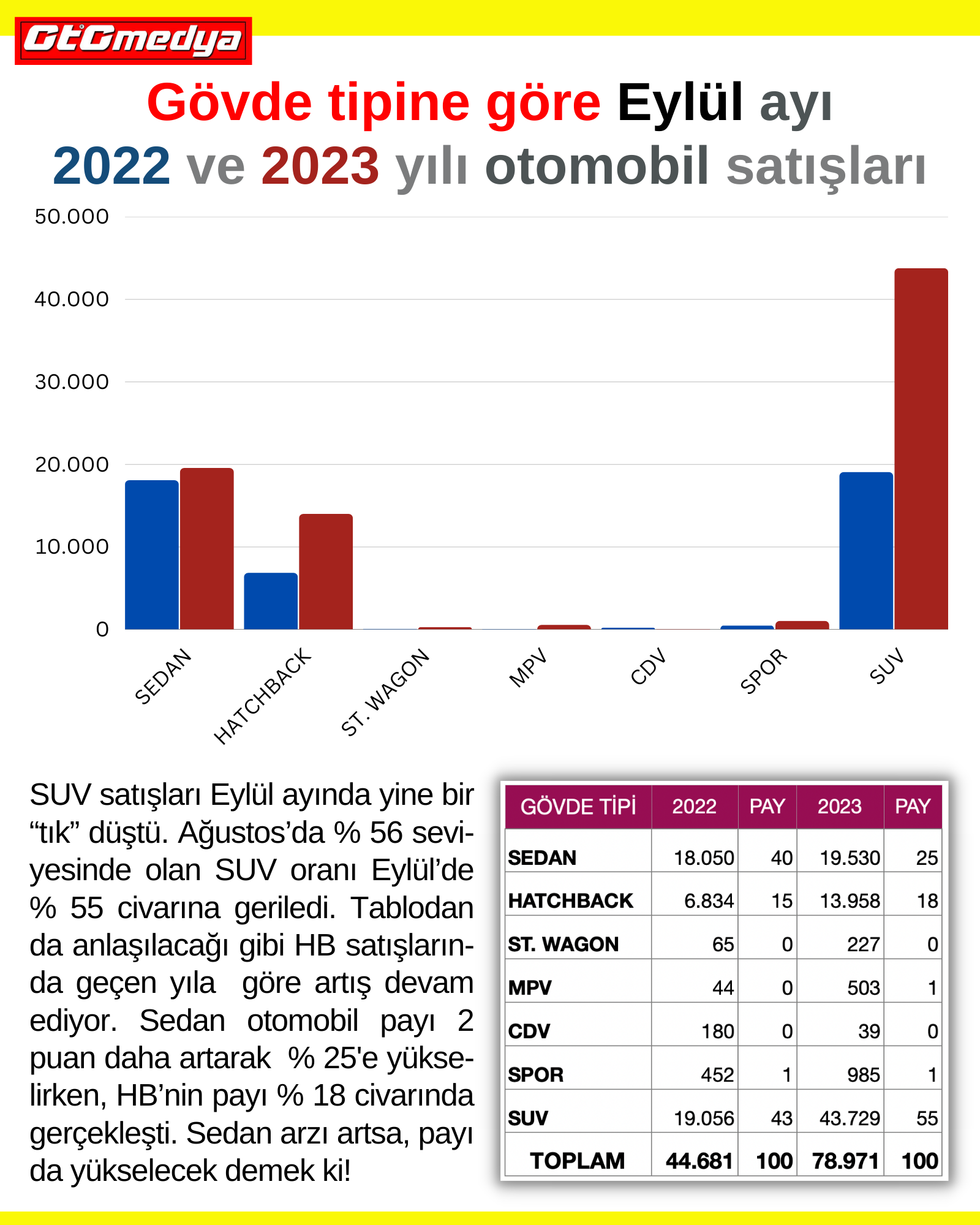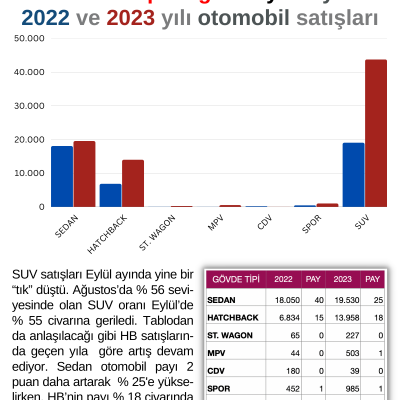 SUV satışları Eylül ayında yine bir “tık” düştü. Ağustos’da % 56 seviyesinde olan SUV oranı Eylül’de % 55 civarına geriledi. Tablodan da anlaşılacağı gibi HB satışlarında geçen yıla göre artış devam ediyor. Sedan otomobil payı 2 puan daha artarak % 25'e yükselirken, HB’nin payı % 18 civarında gerçekleşti. Sedan arzı artsa, payı da yükselecek demek ki!